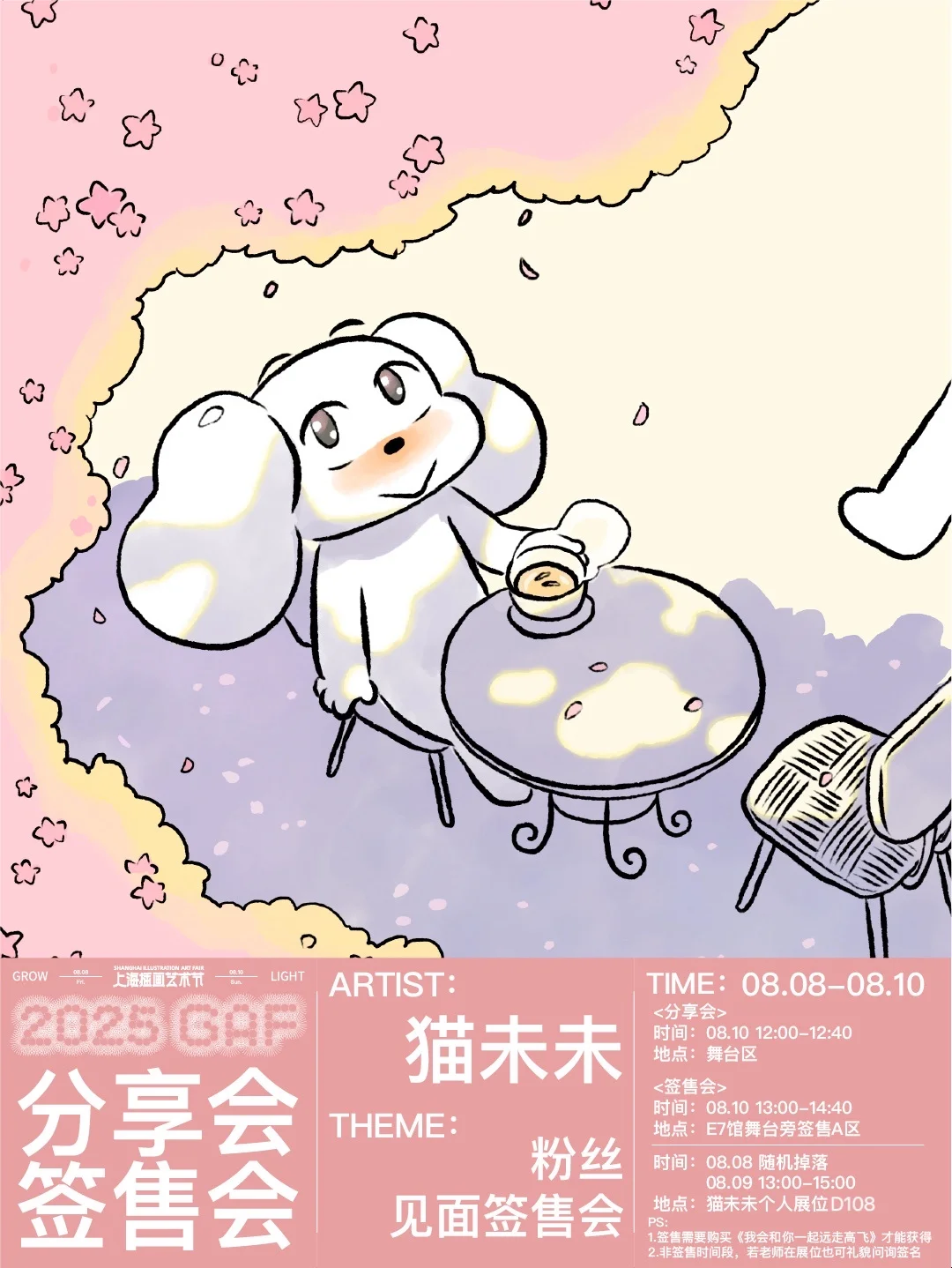 一直想去GAF欣赏大家的画,这次终于在上海成行啦,届时我会到现场给大家签绘,还有新品周边限定发售(少量的试水、目前仅限本次活动) ✨p3是童工vivi画的海报 ✨p4是活动信息——9号13:00-15:00在猫未未展位D108签售;10号12:00—14:40在舞台区有分享会+签售; ✨书和周边都可以签,是我的就行~to签+签绘每人限3组,除此以外可签名(不限量) ps:gaf是有门票的,想去玩的大家要提前看好。🫶