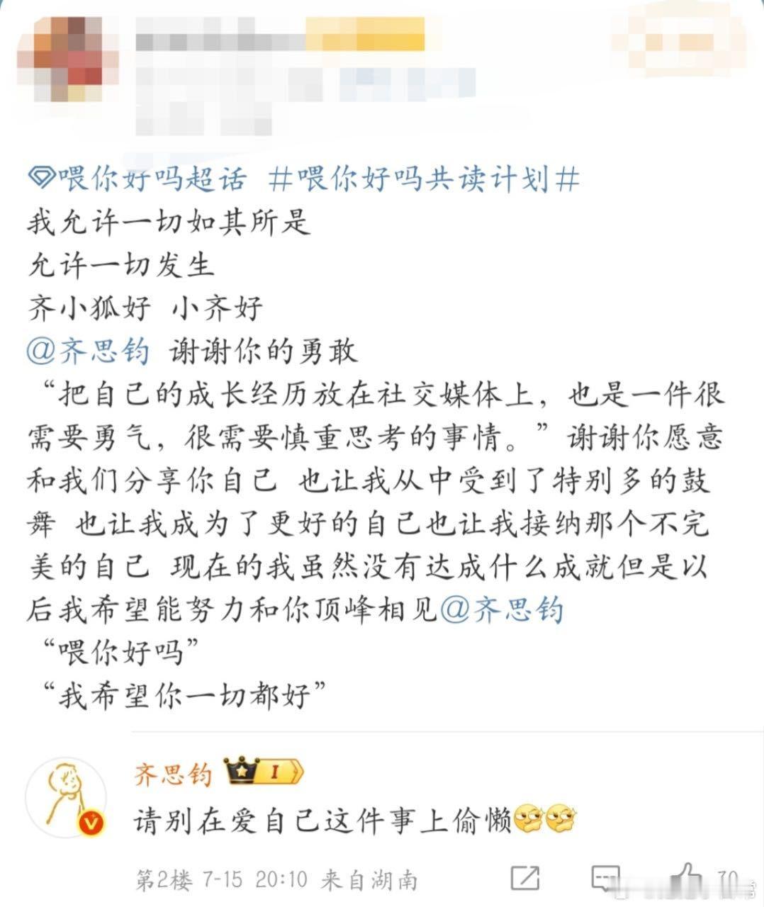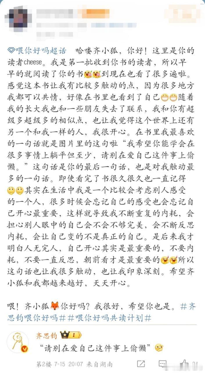 齐思钧把心理疗愈经历写成了书 齐思钧的《喂,你好吗?》满是温柔!他把自己的心理疗愈经历坦诚写进书里,因为有过同款经历所以特别能共情大家,连带着把书带去节目分享,人和文字都暖到让人想靠近!