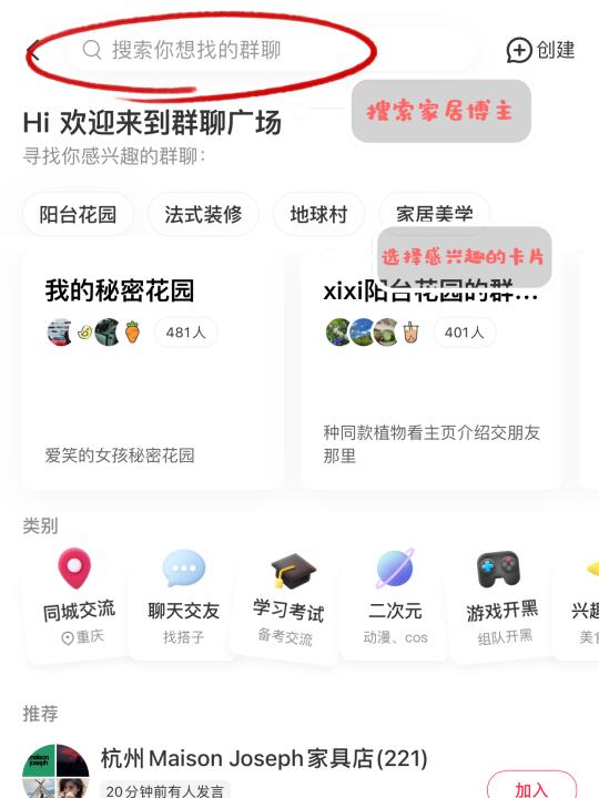 每月复盘总结,后台看自己的数据变化。多和其他博主交流!现在可以逛群聊广场pick感兴趣的群,你可以在类别里找到家居,看看大家感兴趣的话题。或者输入家居博主这个关键词,找到组织,多和大家一起交流经验。这样会提升的更快