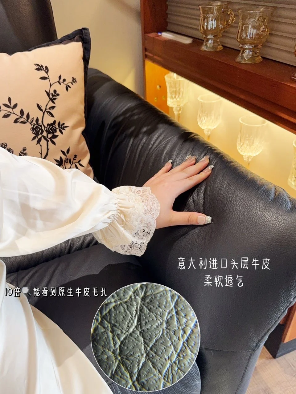 沙发的接触面用的都是意大利进口的头层牛皮,手感柔软细腻,每次入座都能温柔的接住身体的所有疲惫~