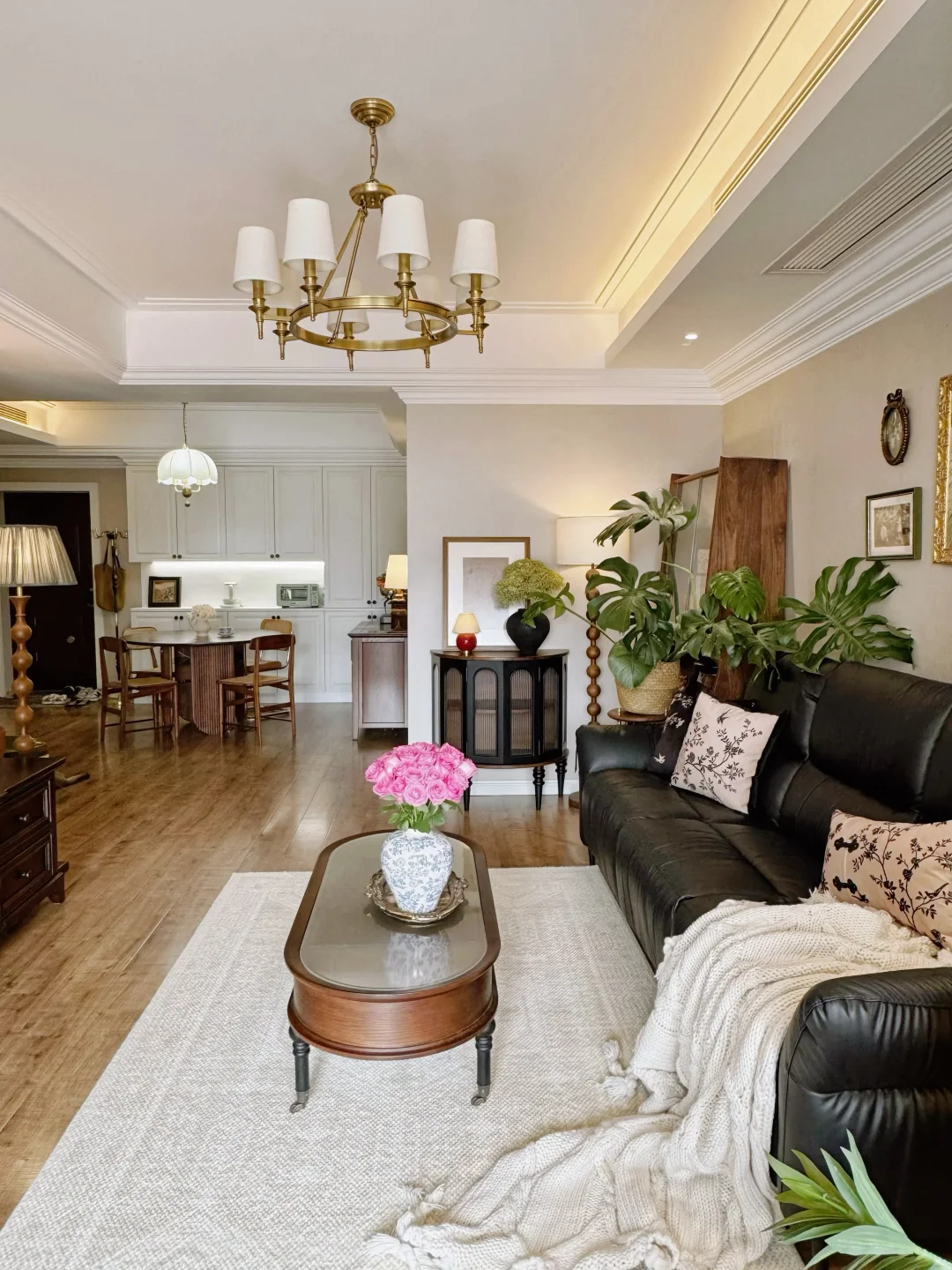 硬装上简洁不失线条感,墙面不做石膏线和复杂的背景墙,软装上胡桃色木地板通铺,搭配铜制灯具、鲜花绿植加持🌿