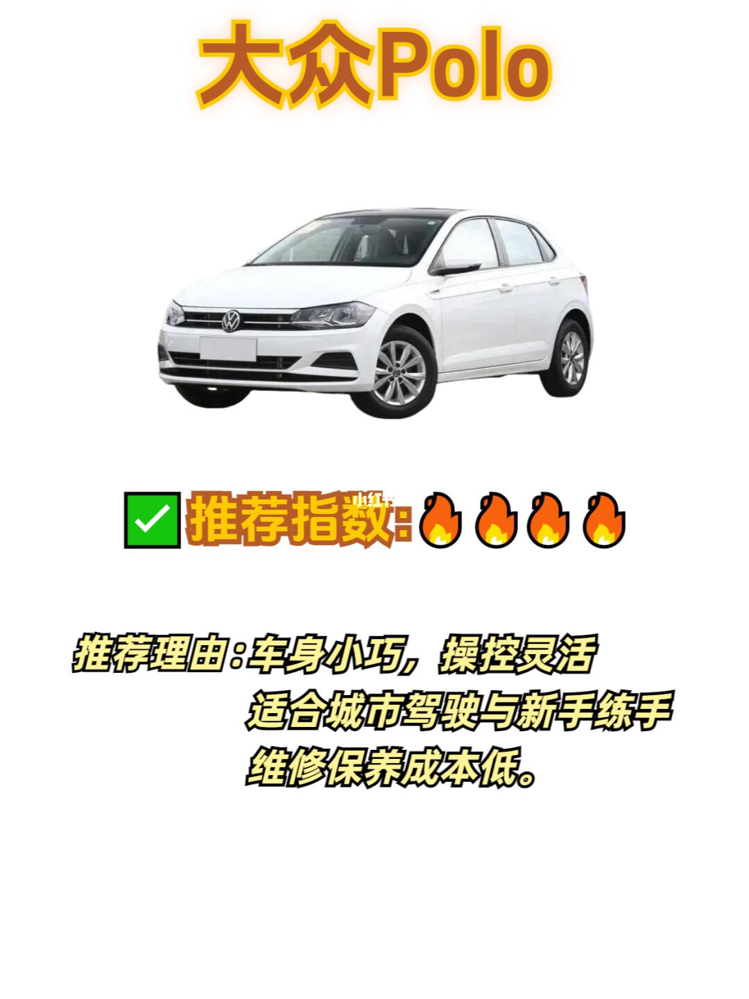 推荐理由:Polo车身小巧,操控起来特别灵活,即使在繁忙的城市道路上也能轻松驾驭。而且它的维修保养成本相对较低,对于新手来说非常友好,不用担心因为小刮小蹭产生高额的维修费