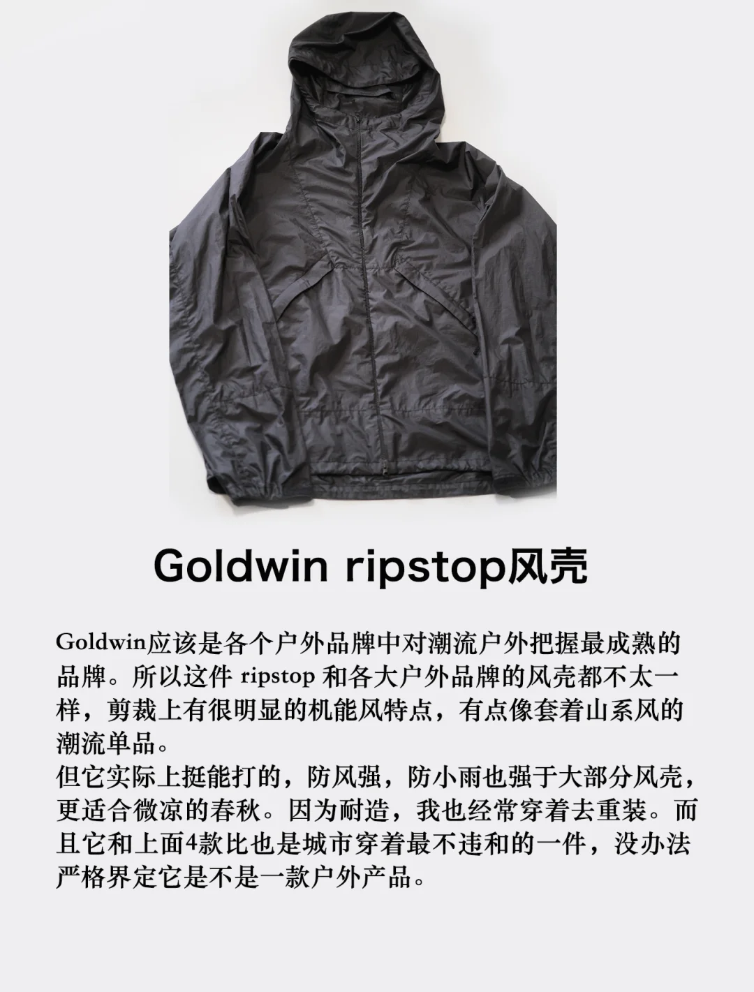 Goldwin应该是各个户外品牌中对潮流户外把握最成熟的品牌。所以这件 ripstop 和各大户外品牌的风壳都不太一样,剪裁上有很明显的机能风特点,有点像套着山系风的潮流单品…