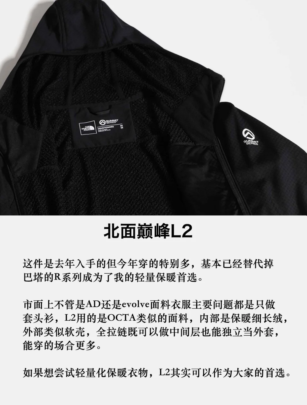 这件是去年入手的但今年穿的特别多,基本已经替代掉巴塔的R系列成为了我的轻量保暖首选,市面上的不管是AD还是evolve面料的衣服主要问题都是只做套头衫…