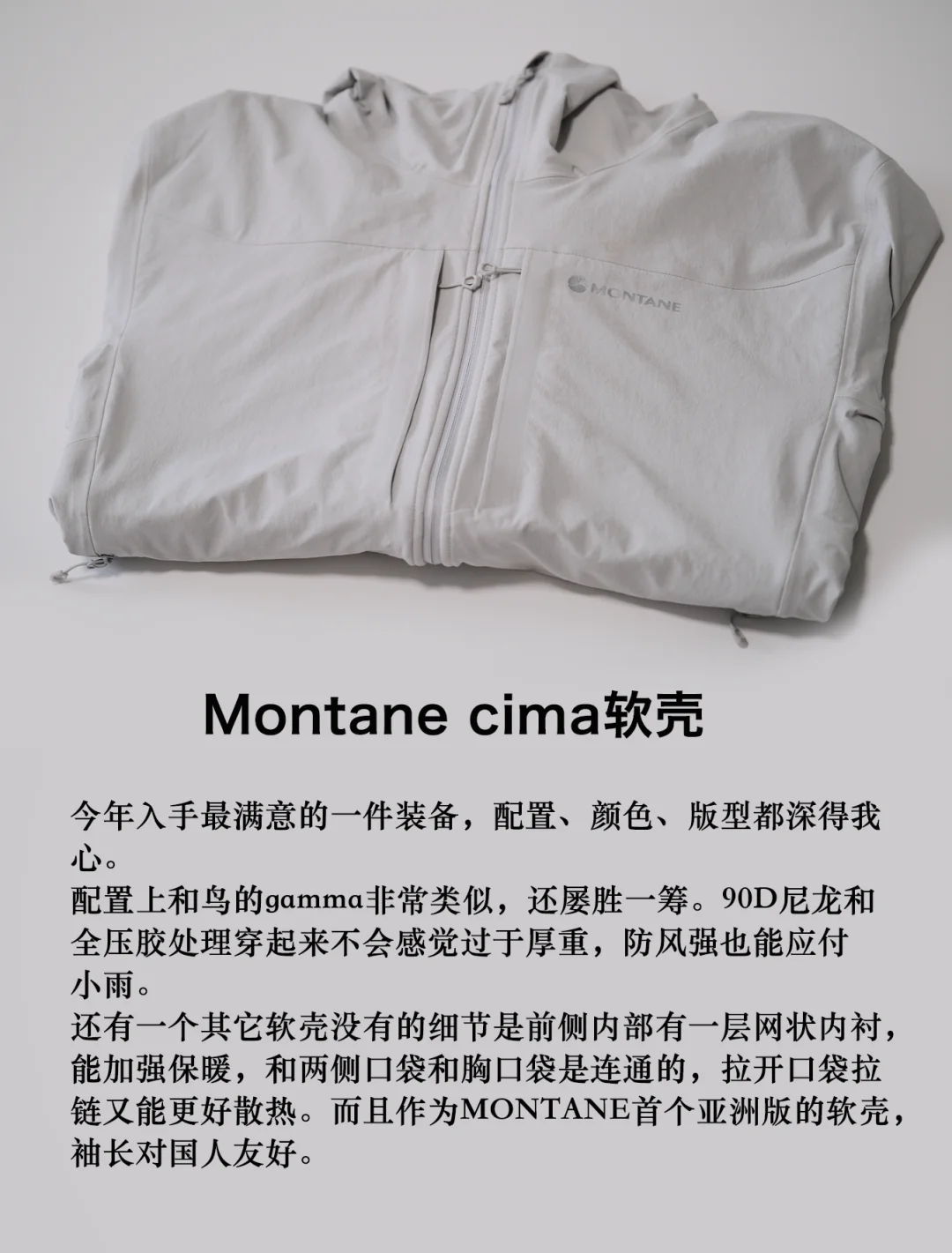 今年入手最满意的一件装备,配置、颜色、版型都深得我心。配置上和鸟的gamma非常类似,甚至屡胜一筹。90D尼龙和全压胶处理穿起来不会感觉过于厚重,防风强也能应付小雨…