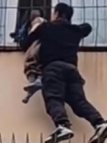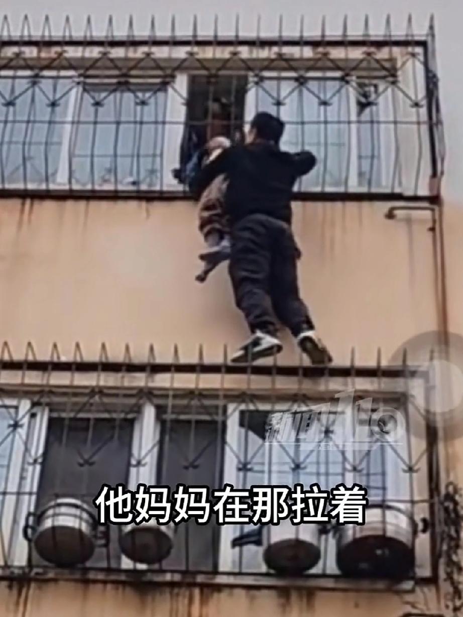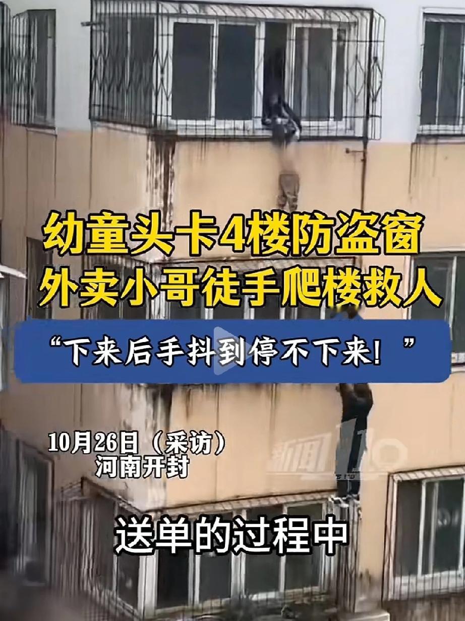 外卖小哥送单时路过小区,恰巧遇到幼童头卡在4楼防盗窗里,外卖小哥见情况危险想都没想徒手爬到了四楼的阳台外,右手抓住防盗窗左手托着孩子的下半身,屋内孩子的妈妈为了拉住孩子早已体力不支,危难之时幸亏小哥出手相救,孩子才得以脱险!小哥下楼后手抖的停不下来,当时早忘记了害怕,过后才感觉救孩子的过程是多么可怕,万一有个闪失自己就有丧命危险!感谢小哥救了孩子挽救一个家庭!