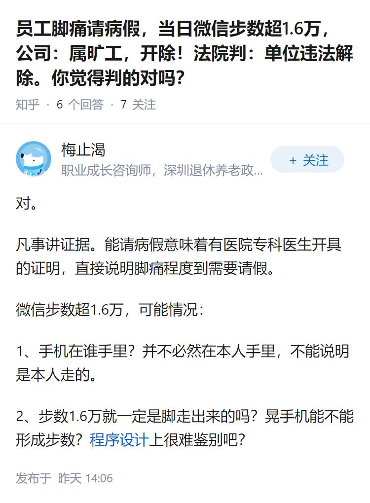 员工脚痛请病假,当日微信步数超1.6万,公司:属旷工,开除!法院判:单位违法解除。你觉得判的对吗?