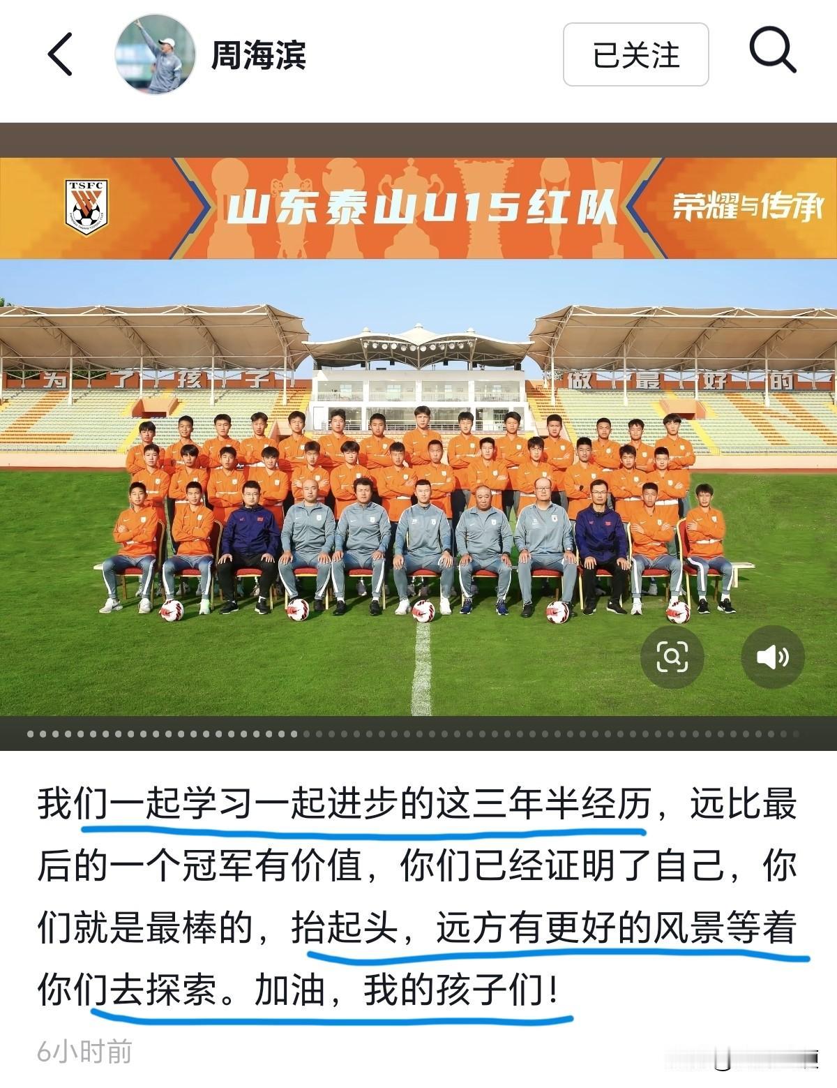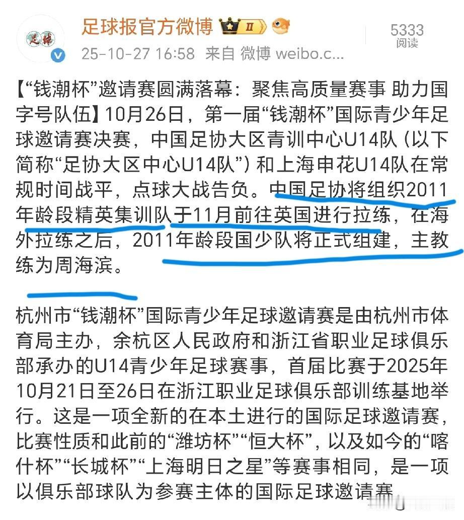 交叉印证!不是10年龄段!周海滨将出任2011年龄段国少主教练,这下估计董路可以松口气了[笑哭] 北京10月27日下午,据《足球报》最新消息,中国足协将组织2011年龄段精英集训队于11月前往英国进行拉练,在本次海外拉练结束之后,2011年龄段国少队将正式组建,主教练为前国脚周海滨[击掌] 无独有偶!前国脚周海滨也在其个人媒体上发布疑似告别感言[作揖] 从这两方面信息交叉印证,周海滨出任2011年龄段国少队主教练已经是板上钉钉,已经无需官宣了[击掌] 而此前传的沸沸扬扬周海滨将出任2010年龄段国少队主教练的消息,让董路那些足球小将的粉丝都快要崩溃了,评论区几乎都是10国少队完了、10国少队没戏了的类似评论…… 这回周海滨出任2011年龄段国少队主教练,可算是远离了网红留洋球员和董路粉丝的纷扰,有了安静带队的氛围[加油] 不过,此番周海滨出任2011年龄段国少队主教练,对于董路未来直播付费解说11国少队比赛而言,可得小心谨慎一些,因为这个队不但是周海滨带队,而且不出意外的话,这个队的锋线大腿将会是唐华健,一旦付费解说信口开河,老唐的铁拳可不是吃素的[碰拳]