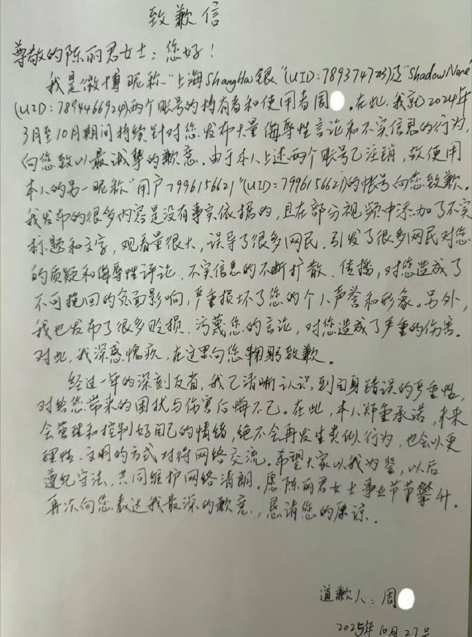 陈丽君黑粉公开视频致歉及手写道歉信致歉!!支持维权[拳头]
