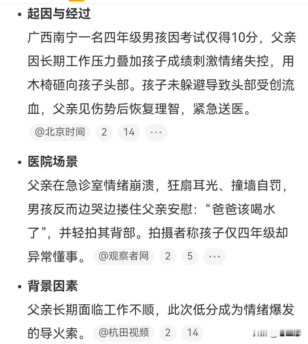 人生真的是太难了。10月7日,媒体报道了这么一个事件。 孩子考10分遭父亲板凳砸头,考十分,小学四年级。 这个分数确实是相当的糟糕。 父亲把儿子砸后,将儿子送到医院自责的大哭起来。 儿子也十分的懂事,拍老爸的后背安慰。 分数差一点就差一点吧,也希望孩子能够开窍,早日把分数补上来。 再怎么冲动,也不能用板凳砸头啊。 砸伤了还要出钱治。 一定要冷静,冲动是魔鬼啊。