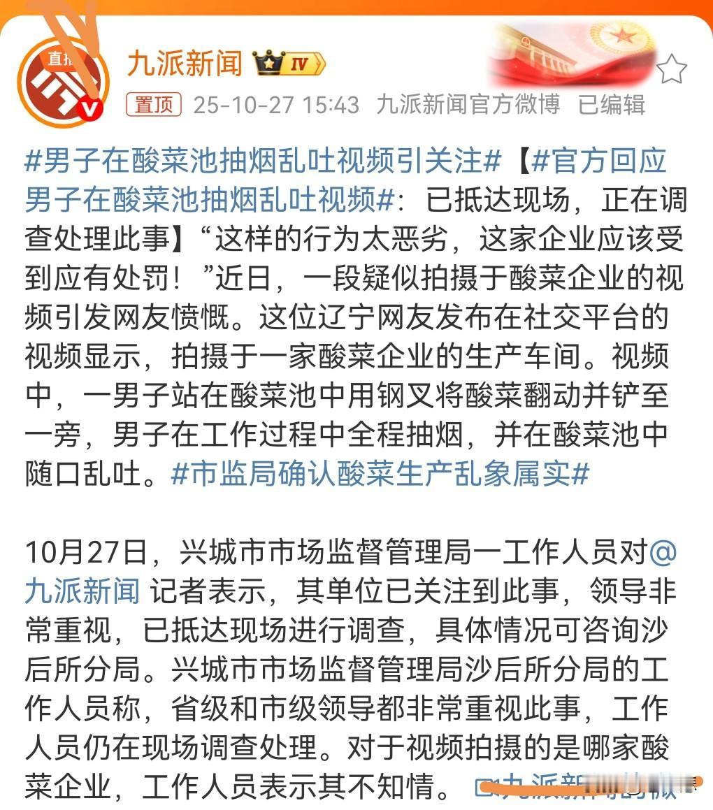 看来这不是个例啊,一些酸菜企业确实有很大的问题呀。 近日一段视频已关注,男子在酸菜池抽烟乱吐。 这真的是太恶心了,又是烟灰又乱吐。 这不查肯定是不行了。 有关部门也是非常的重视。 一定要好好的惩罚这家企业。 也要将涉事人员开除。 毕竟是太没公德心了。