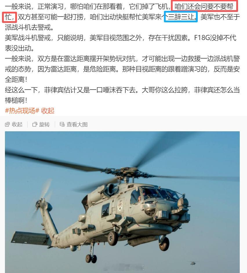 笑死,上午对于老美在南海坠毁一架海鹰直升机和一架F18大黄蜂,还说了咱们会问老美要不要帮忙~~