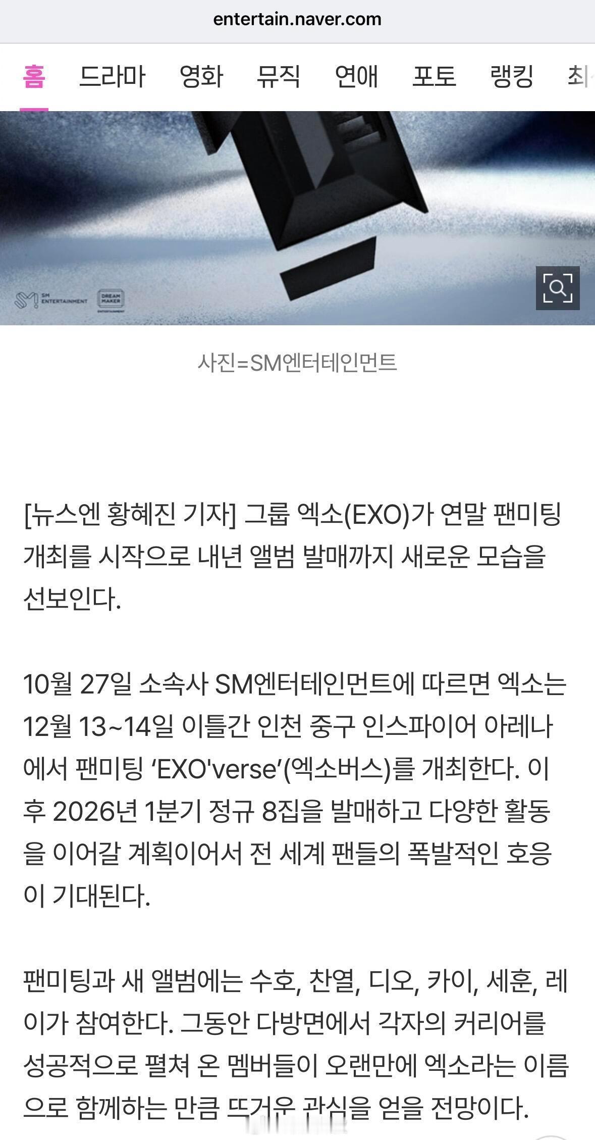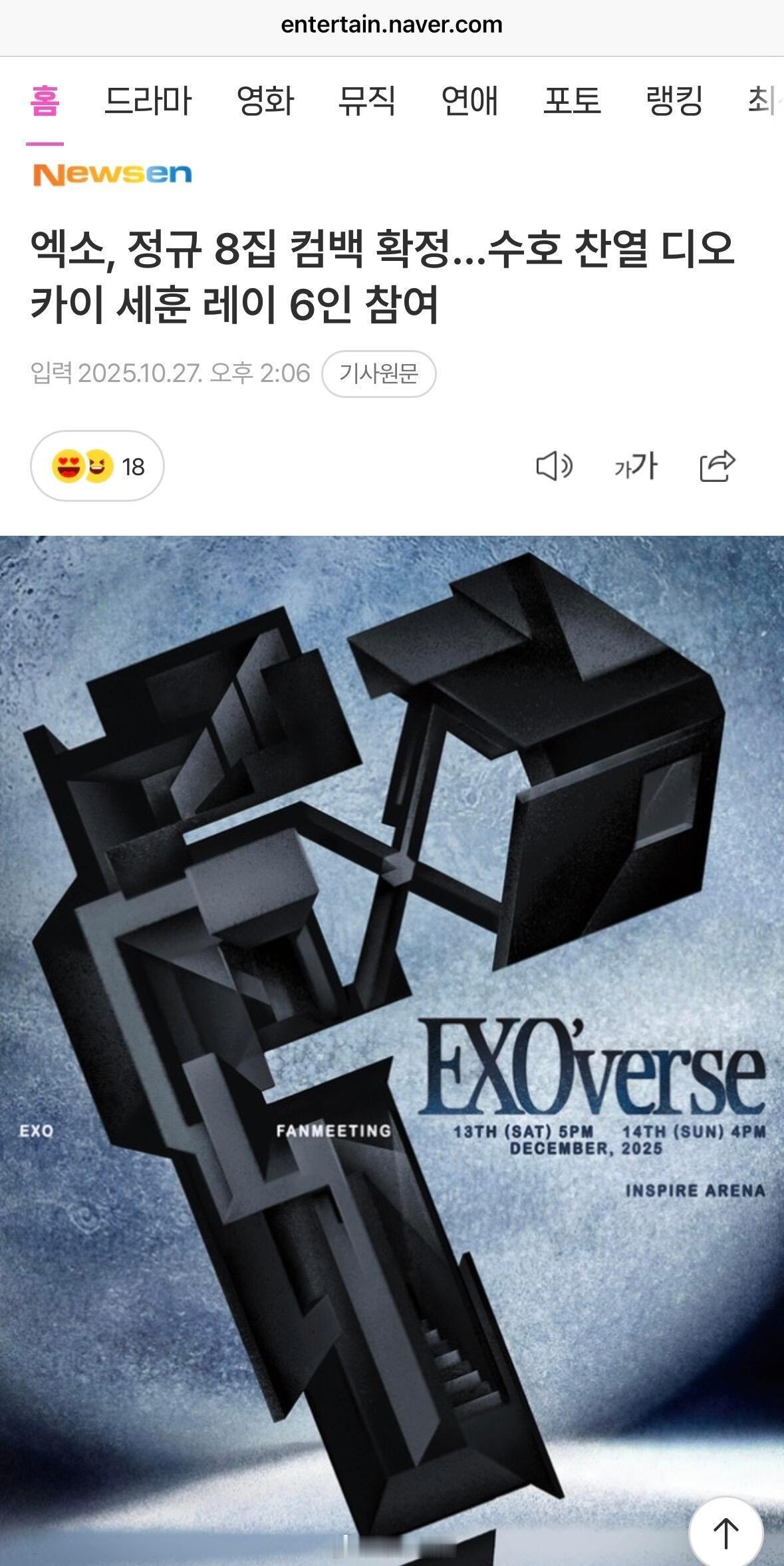 10月27日,根据经纪公司SM娱乐的消息,EXO将于12月13日~14日两天在仁川中区Inspire Arena举办粉丝见面会'EXO'verse'。之后2026年第1季度发行正规8辑,计划继续各种活动,期待全世界粉丝的爆炸性反响。