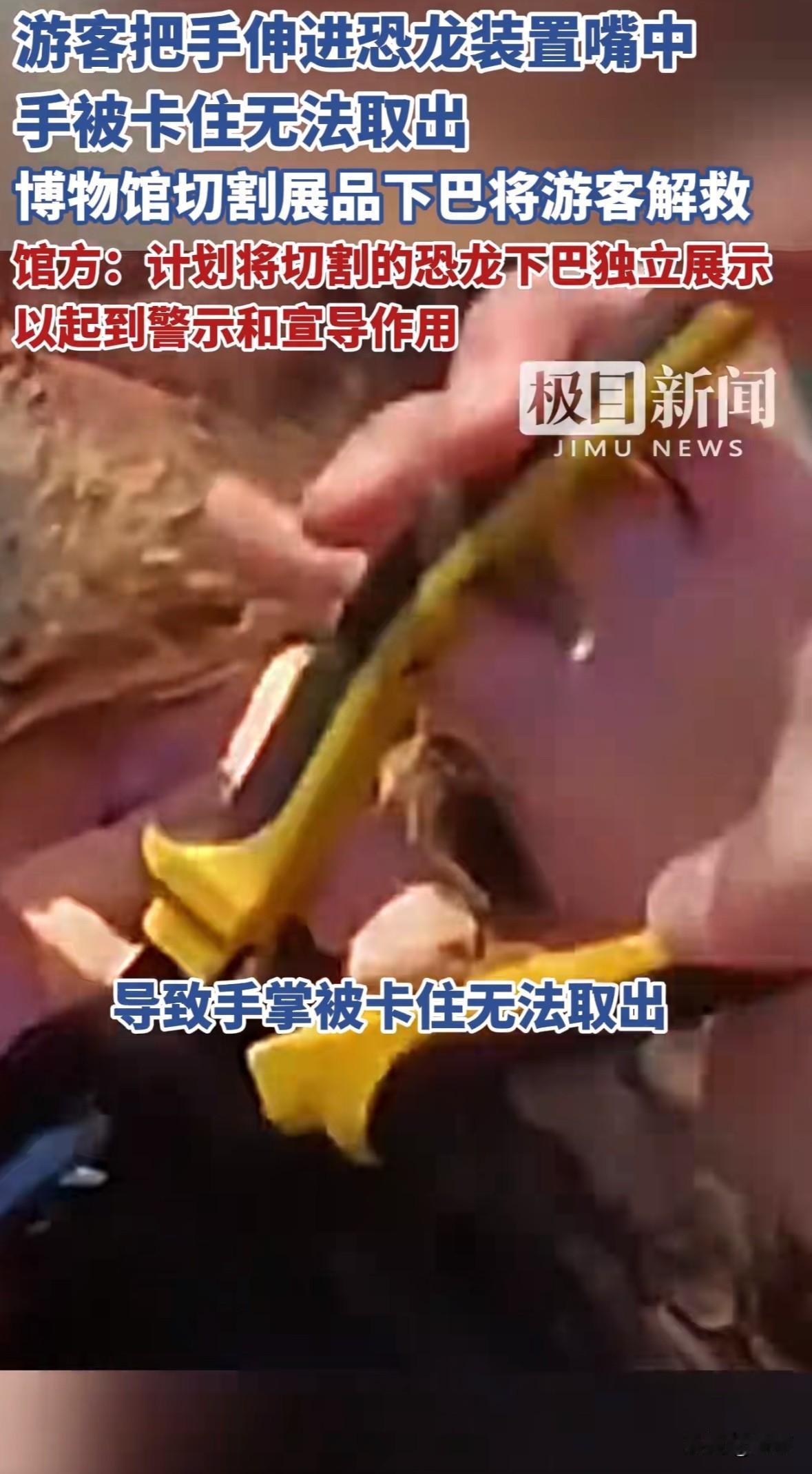 10月25日13点09分,广州正佳自然科学博物馆,一名成年游客越过隔离护栏,把手伸进窃蛋龙装置嘴里,结果手掌被卡住拔不出来。 监控里他试着用另一只手解困没成功,手掌因长时间压迫开始失色。馆方没法,只能切割恐龙下巴,13点35分才把人救出来。 这装置本来是演示下蛋的,挺受游客喜欢,现在直接“停工”了。馆方说以前偶有不文明参观,但成年人闹到要拆展品还是头回见,打算把切下来的下巴单独展示警示。 网友吵开了,有人说他自讨苦吃,该赔修复费;也有人问博物馆安全保障够不够。 明明有护栏和提示,偏要伸手。公共设施不是玩具,文明参观既是护公物,也是护自己安全。