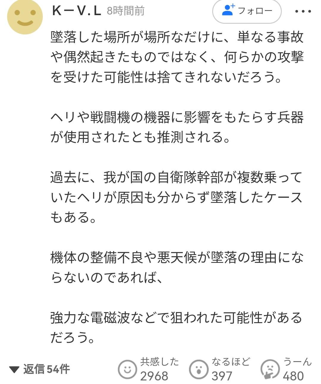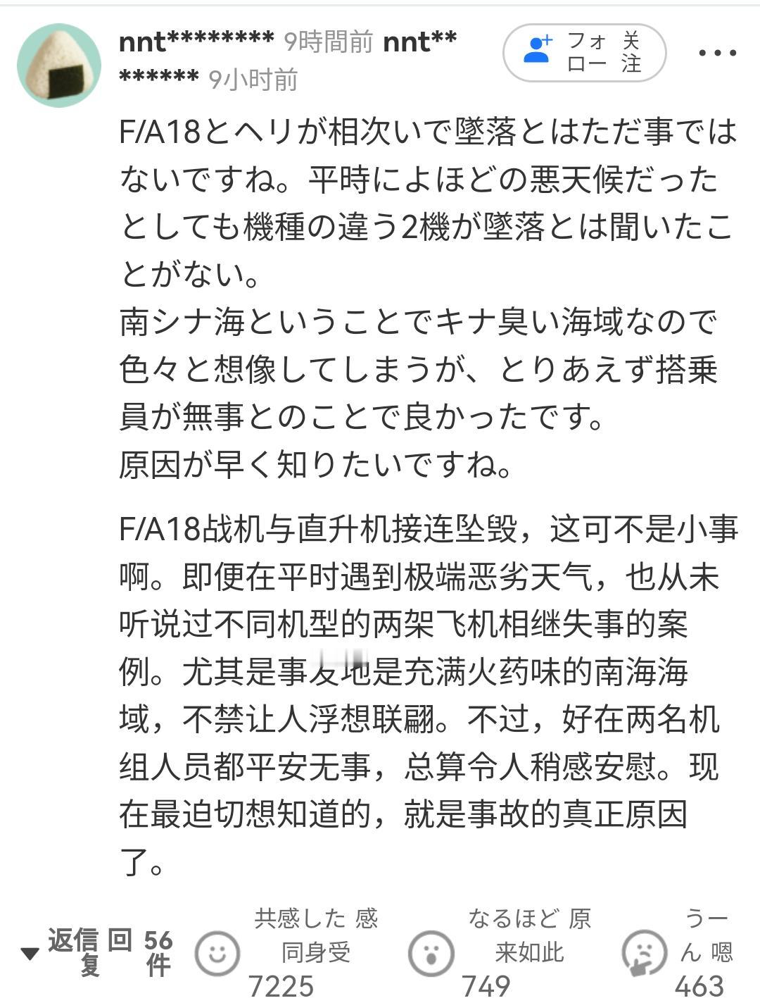 尼米兹连掉两架飞机,还是在南海掉的,这事在日本网民看来肯定跟我们脱不了关系。定向能武器、超音速武器、电磁波武器等等都成了猜测对象。连几年前下海潜泳的自卫队师团长都被拉出来佐证他们的观点。 按日本网民的观点,能同时放飞直升机和固定翼飞机,说明当时无论是海况还是天气都是没问题的,飞机没发生碰撞,也不可能是两种飞机都着舰失败或机械故障,唯一的解释就是飞机受到了外部攻击,至于攻击来自于谁就有说道了。不过,最后公布的调查报告肯定和潜水师团长一样,机械故障。 对我们来说这就是典型的人在家中坐,锅从南海掉的来。看到日本网民的言论,有种被人凭空污了清白的感觉。当然,如果我们真的有这么猛的电磁武器,那绝对值得暗爽一把!