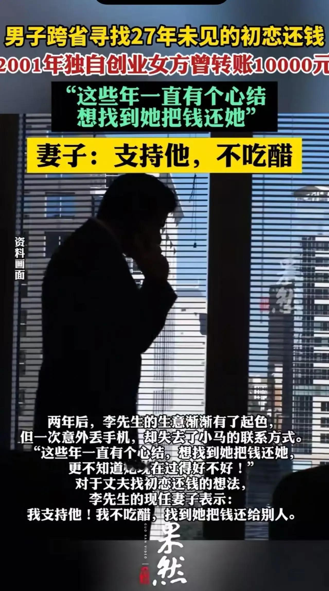 一位男子竟然跨省寻找27年未见的初恋,只为还钱!这究竟是怎样的深情,还是背后有更复杂的故事?让我们一起揭开这段尘封已久的往事。 据男子透露,2001年他独自创业时,遇到了资金困难,是初恋女友转账给他1万块钱,助他度过了难关。这些年,男子一直心存感激,也始终有个心结,那就是找到初恋,把钱还给她。如今,男子事业有成,决定跨省寻找初恋,完成这个多年的心愿。对于丈夫的这一举动,妻子表示非常支持,甚至直言不吃醋,认为这是丈夫重情重义的表现。然而,网友们却对此议论纷纷,有人认为27年前借的1万块,现在大概要还10万才行,否则难以表达诚意。更有网友直言,男子其实就是心里还有初恋,想借此机会见见她。不过,无论网友们如何猜测,男子的初衷是单纯的,他只是想找到初恋,还上那笔钱,了却多年的心愿。 这段跨越27年的还钱之旅,不仅体现了男子的诚信与感恩,更让我们看到了人与人之间真挚的情感。对于这件事,你有什么看法呢?快来评论区留言讨论吧!初恋 初恋追忆 初恋旧忆 初恋情人在哪