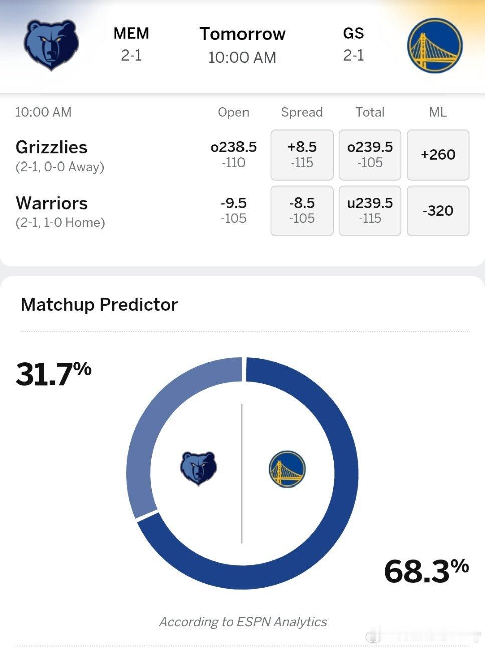 ESPN预测胜率,勇士68.3%,灰熊31.7%,勇士-8.5分。😲