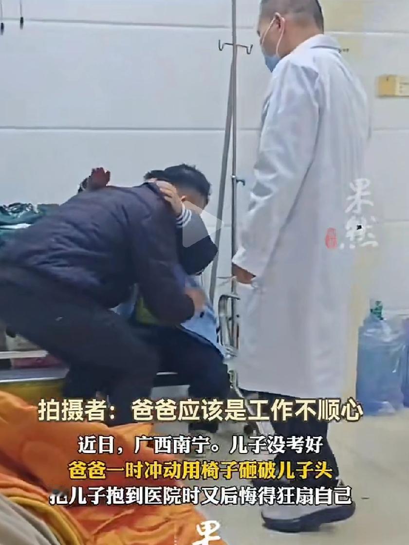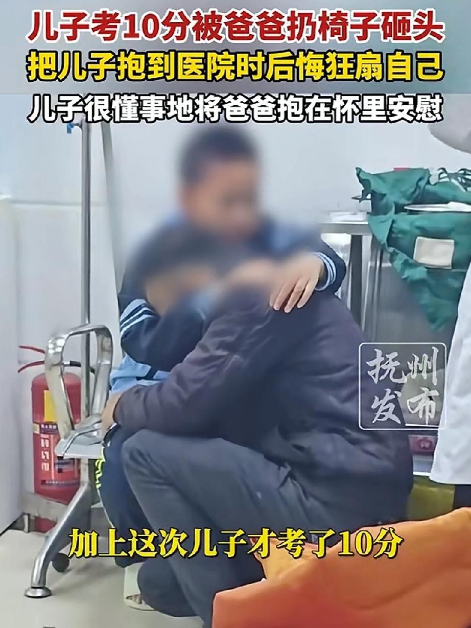 儿子考试考了十分,被爸爸扔椅子砸破了头,抱到医院后爸爸逛扇自己,儿子把浑身颤抖的爸爸搂在怀中,此时的爸爸难受儿子哭了,在逛扇自己的那一刻爸爸已经后悔了,爱恨交加的心情完全理解,做家长的都望子成龙,孩子虽然成绩不好,但很懂事知道搂着爸爸安慰他,孩子的天赋可能有限,这位爸爸把心态放好,分数不代表人品,更代表不了将来的成就,只要孩子平安健康就好!