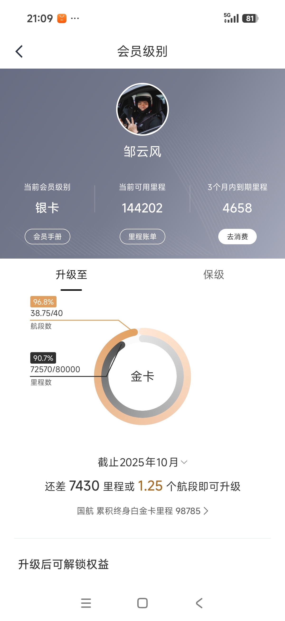 而且按我以往经验,只要不起飞,哪怕你花钱买了票不退,它也不会积累里程。钱扣了能升级成金卡我觉得也行,但好像金卡也累计不成。