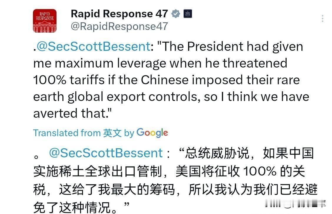 【贝森特出来讲话了,中美达成的部分协议被美国曝光!】美国财长贝森特在接受采访时表示,特朗普总统在11月1日威胁要征收100%的关税,给了我很大的谈判筹码——我相信我们已经达成了一个非常实质性的框架,可以避免这种情况,并允许我们与中国讨论许多其他事情。所以我认为我们已经避免了这种情况。谈他个10年8年不要签协议。时间优势在我。没有稀土。美国造不出导弹和飞机。打仗明显处于劣势。其实,中美贸易谈判最最核心的部分就是我们李成钢副部长说的“出口管制”问题,我们不把它叫做“稀土问题”了,因为双方都在搞出口管制,美国搞芯片管制,我们对等还以稀土管制,要松就一起松手。美方100%征税本来就是虚空出牌,敲诈勒索的计量,不能算在谈判的内容里。不然,以后随时可以拿出来勒索我们。谈判就是已经增加的关税、高科技封锁、金融战、高端芯片、实体名单这些,凭空造牌的,不能纳入谈判。美方必须撤销自2018年以来所有的不正当关税,撤销所有针对中方的不合理限制、管控措施,确保中方企业正常的营商环境。关税战咱还真不怕你了!美帝想打关税战,他怎么打,我们就加倍还;美帝想打多久,就打多久,一直打到我们完全胜利美帝彻底趴下为止。到美国要想在所谓产业回归,牵扯的各个方面的产业互相哺育那可不是几年,几十年能完善的!美国国家资本无力搞这些,私人资本没有一定利润也不是轻易“爱国”投资建设摆弄的。而东大,基础性的,长远利益的即使都是国家背着,支撑着的,从而抚育出各方面的成长,发展。可惜,美国没有国家这个娘。