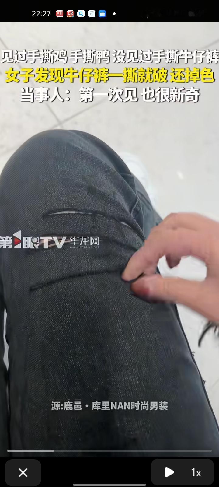 10月23日,周口市鹿邑县。见过手撕鸡、手撕鸭,没见过撕牛仔裤的,女子发现牛仔裤一撕就破,还掉色。当事人田女士介绍,这是去年合伙人买的裤子,100元,吊牌都没摘。今年她家装修,把衣服挪在阳台上了,暴晒一个夏天,可能是风化了,碰到这种情况就感觉很好笑。