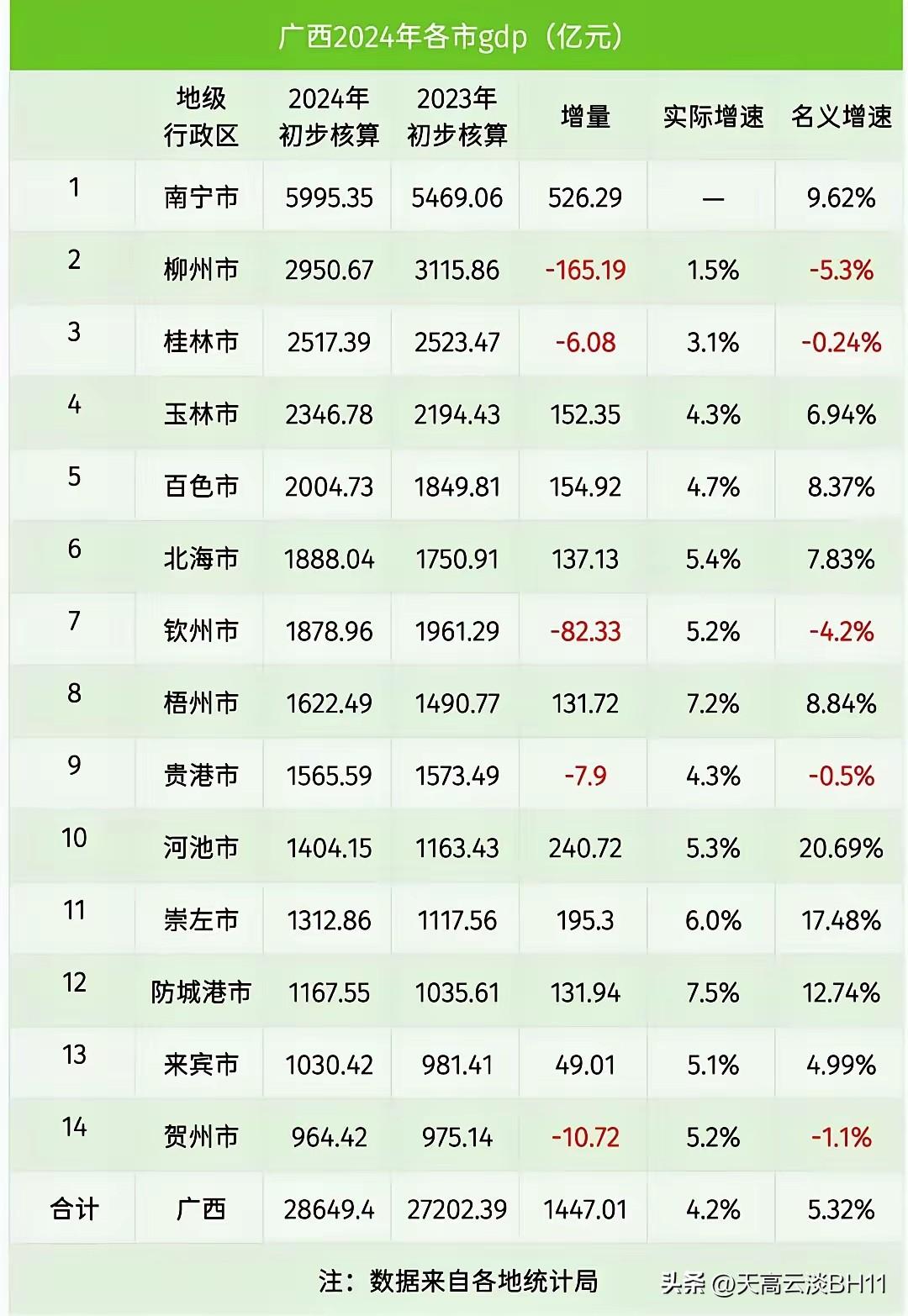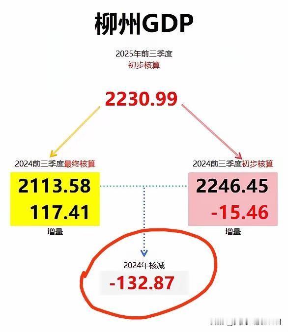 实话实说,今年前三季度,柳州与钦州的GDP有了一定的提升,但远未到值得大肆庆贺的时候!关键在于该如何进行比较! 看钦州: 2025年前三季度,钦州GDP达1325.42亿元。与2024年最终核算的1306亿元相比,增量为+19亿元,名义增速为+1.46%;与去年初步核算的1457亿元相比,增量为 -151亿元,名义增速为 -9%! 看柳州: 2025年前三季度初步核算数据为2230.99亿元,看似增长了117.41亿元。然而,与2024年前三季度初步核算的2246.45亿元相比,增长就要变为 -15.46亿元! 毫无疑问两市都选择以2024年前三季度最终核算的较低数据作为参考,这样面子上也说得过去。