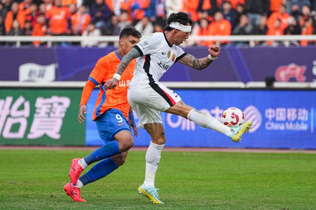 10月26日,36岁的,上海海港队球员张琳芃(右)带伤坚持比赛。新华社记者朱峥摄