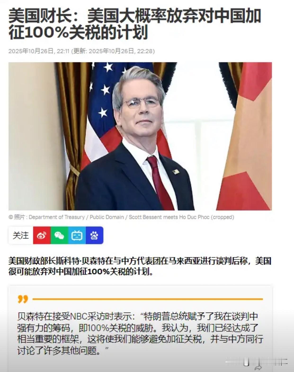 中美马来西亚经贸会谈传来积极信号,根据美方的说法:“关税休战期”大概率再延长,100%威胁关税,已经取消了。 就像一首歌里唱的那样:来也匆匆,去也匆匆,恨不能相逢。 前两句说的就是美国100%关税威胁,不论是来的时候,还是去的时候,真的是有种路人形色匆匆的感觉。 说到底还是因为没有任何依据,也没有任何充分的理由,全靠自己的臆想来增加关税,大概美方也知道自己的理由站不住脚,只能靠“匆匆”来掩饰内心深处的不安。 而美方提出的——“若中国对稀土出口实施全球管制,美方将对中国商品加征100%关税”。 就像歌词后一句一样“恨不能相逢”,原因也很简单,美国已经是扛不住了,中方在稀土领域的领先地位,决定了中美之间只能靠贸易谈判解决问题,一味的搞对抗不符合双方共同的利益。 分析人士指出,美方此番姿态软化,一方面是国内贸易带来的压力居高不下,迫切需要为美国消费者“减负”;另一方面也表明,完全“脱钩”不现实,“再挂钩” 才是务实选择。 比如在大豆贸易上,中国9月未从美国进口任何大豆,那是因为,我们可以重新寻找大豆的进口国,比如选择大豆产量同样很高的巴西,而美国方面却几乎不可能再找到,像中国一样大豆进口体量庞大的国家。 说到底,中美国际贸易谈判之所以取得进展,不是美国方面有多积极,而是中方又一次展现诚意,打开了那道互惠互利的大门,主动权使始终牢牢掌握在我们的手里。