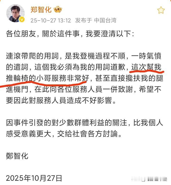 坦白讲,如果我是深圳机场,我是不会接受郑智化的道歉的。 第一,压根没感受到郑智化承认错误的诚意,他说为我的用词道歉,言下之意就是我说的没错,我只是用词不当; 第二,他不向被他污蔑“恶劣”的升降车司机道歉,只评价推轮椅的小哥服务非常好,内心底还是认为升降车司机有问题; 第三,道歉文结尾还要扯一下“少数群体利益”的大旗,重点提了“交给社会各方讨论”,意思就是社会最终会证明我是对的,走着瞧,这是企图把个人污蔑机场工作人员的行为美化成“为少数群体谋取利益”。 郑智化这篇道歉文给我的感受就4个字,你能猜到是哪4个字吗?