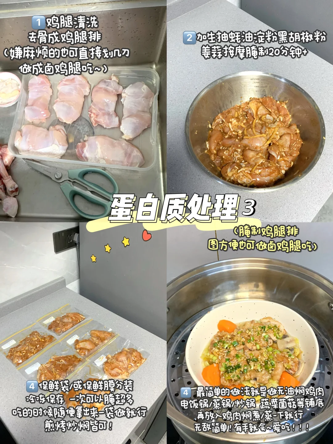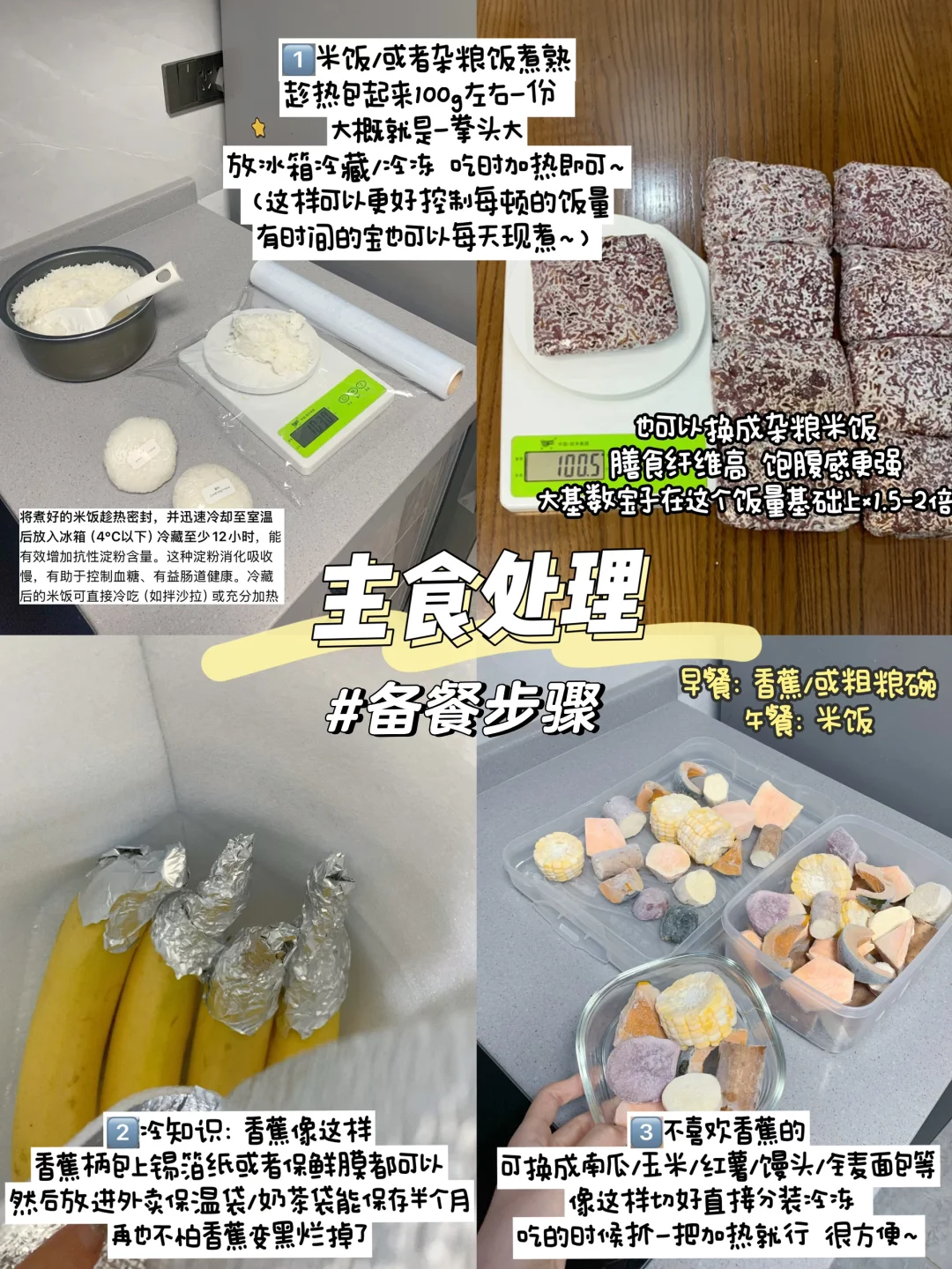 💕注:以上为每顿所用到的基础食材,怕吃腻的宝同类型可以替换,比如1个鸡腿可以换成100g鸡胸肉/牛肉/鱼肉/虾仁等~香蕉可以换成红薯/土豆/贝贝南瓜/苹果/半个玉米等~