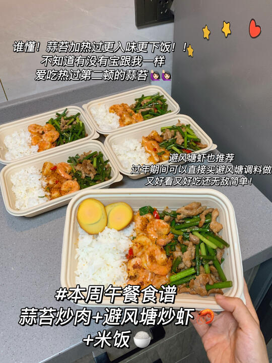 午餐:蒜苔炒肉🥬+避风塘炒虾🦐+米饭🍚