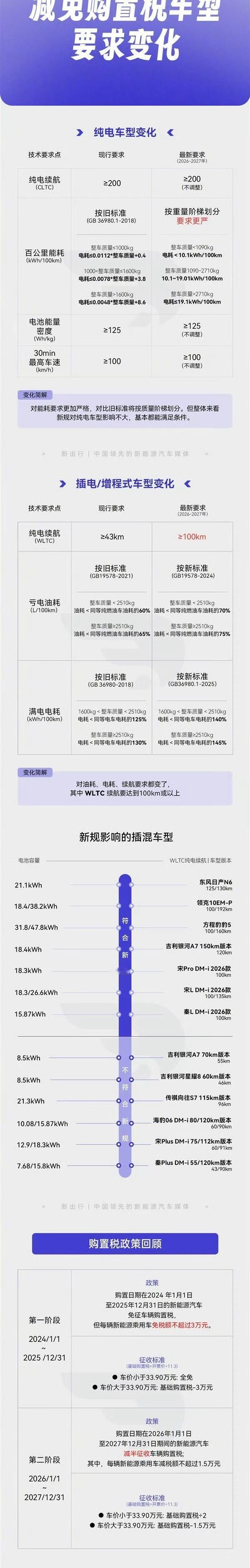 一图看懂新能源车购置税变化 按照要求,多款在售的插电混动车型部分版本将不再符合明年的销售标准,包括吉利银河A7、吉利银河星耀8、传祺向往S7、比亚迪秦PLUS DM-i、海豹06 DM-和宋PLUS DM-i。也就意味着,接下来这2个多月厂家大概率会为了清库存展开促销。