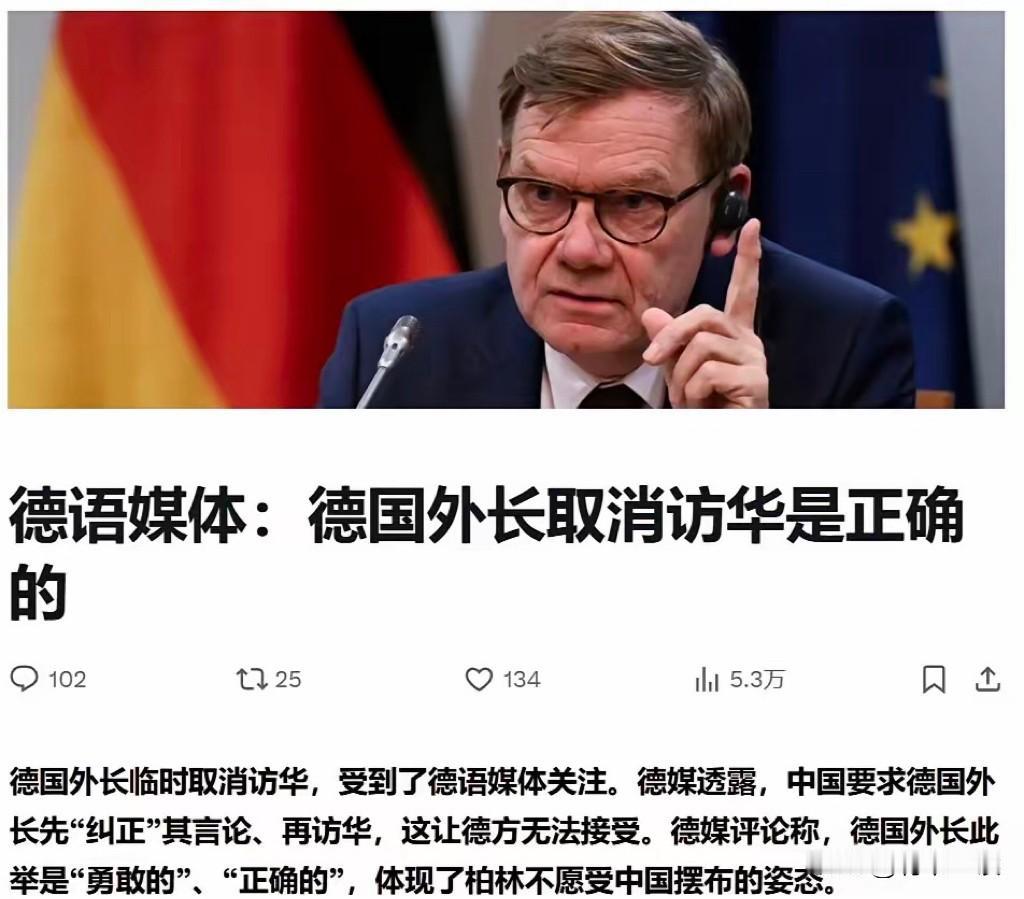 德媒这操作够双标![笑哭][笑哭]太秀了! 想访华捞好处,还容不得中国说“不”,放任外长对华指手画脚,被拒访华还倒打一耙。 当年赚中国钱时咋不“勇敢”?[我想静静][我想静静] 合着只许你对中国指手画脚,不许中国给你脸色看?哪有这样的道理。 当年靠中国市场赚得盆满钵满时咋不“勇敢”?现在自己经济衰退,见不得中国好的小心思藏都藏不住。 其实德国心里比谁都清楚,自己根本离不开中国。如今中国是它最大的贸易靠山,稀土、锂电池这些命脉资源都得靠中国供应,可嘴上还硬要装“硬气”。 这种“嘴硬心软”的操作,说白了就是既想要中国市场的好处,又想跟着美国摆“西方优越感”,可惜世上没有这么好的事。 中国的态度从来简单:想谈可以,带着诚意来;想搞政治作秀、施压找茬,门都没有。德国要是真聪明,就该先管管自己的外长,少搞点意识形态偏见。