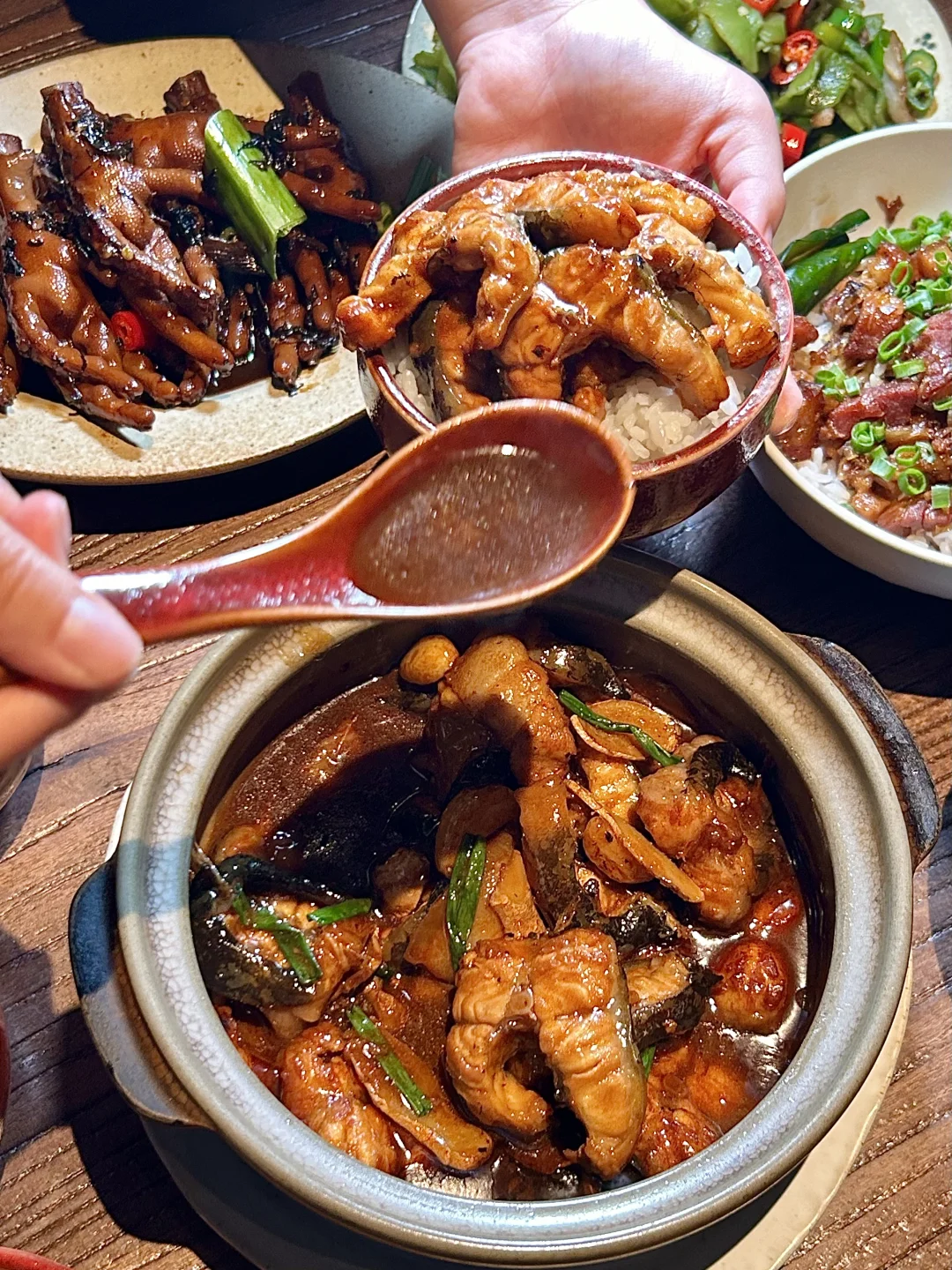 这家家常菜真的太好吃了😋 是会反反复复吃的店!!! 🍚香香卤肉饭 卤肉色泽红亮 酱香十足👍🏻真的下饭 米饭软糯适中 太好吃了 酱汁浓郁丰富!! 🐟生炊鳗鱼煲 鱼肉质细腻 鲜嫩多汁 很入味 酱汁很浓稠🤤口感层次丰富! 🐸麻油爆炒跳跳 香气四溢 肉质紧实有弹性 外皮微焦 内里鲜嫩多汁 很过瘾… 🍮桂香酒酿豆花羹 一定要安排 餐后来一口很绝✨ 滑嫩爽口 入口即化!!一点也不会甜腻