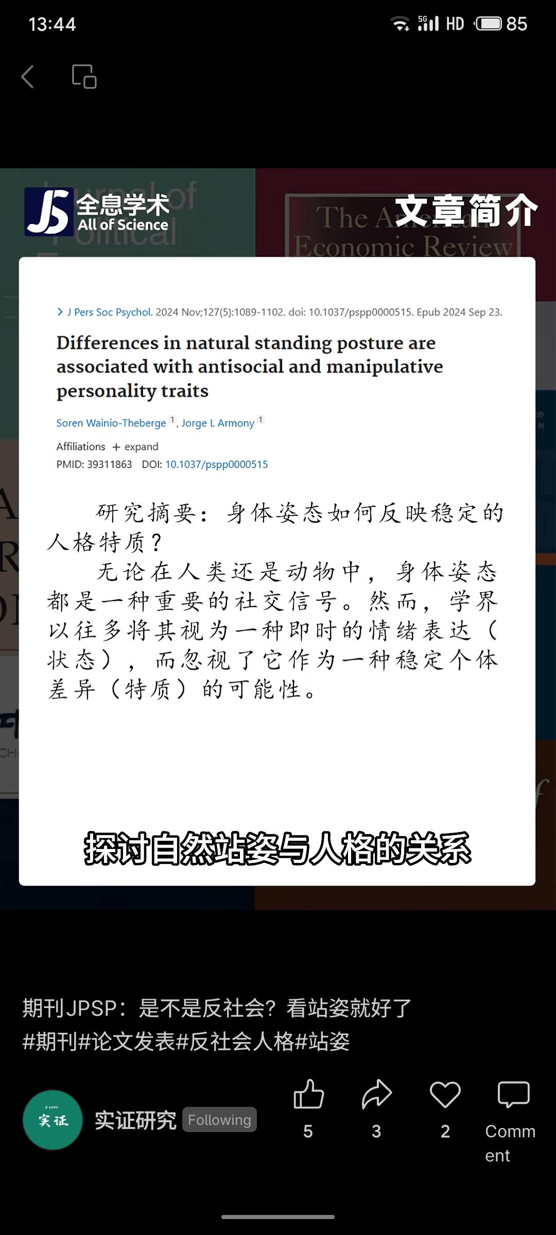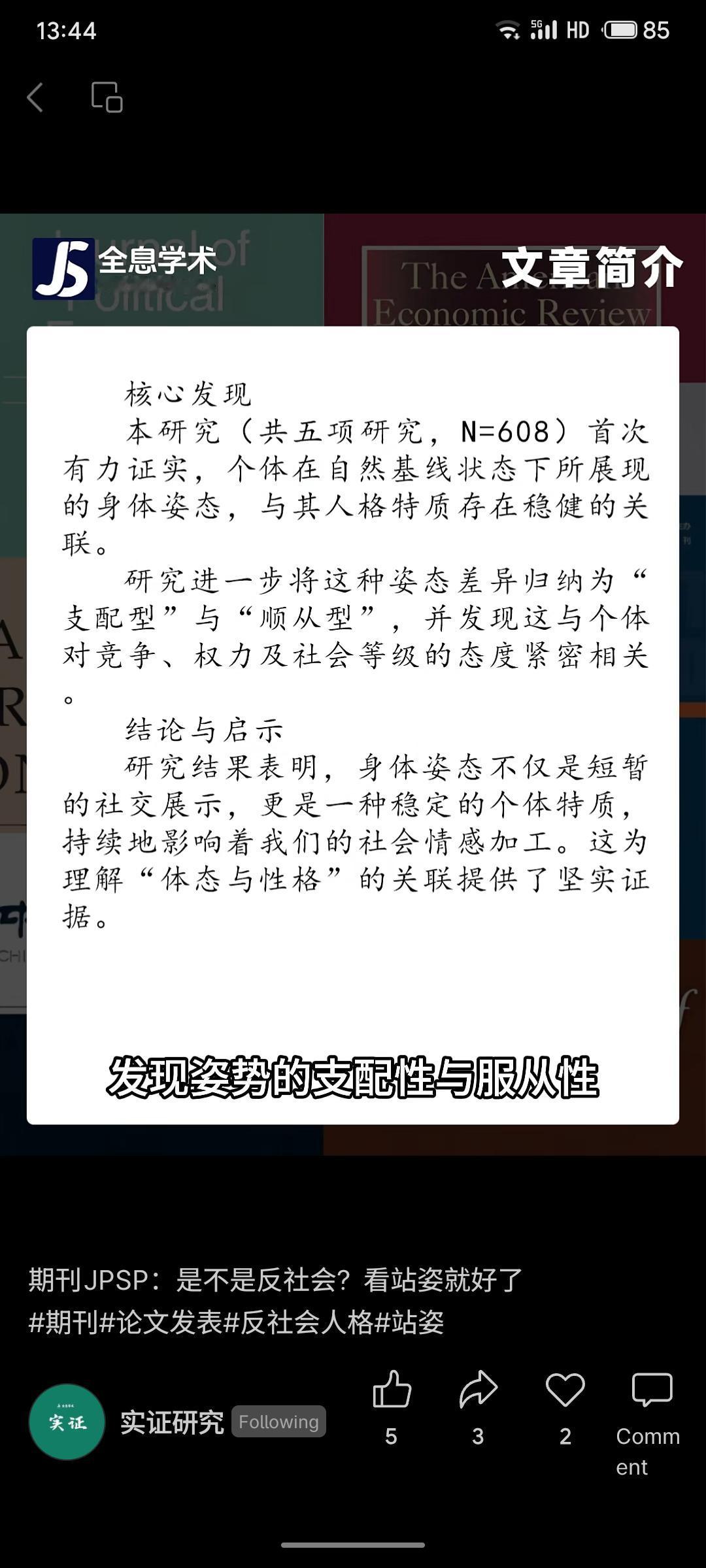 《社会心理学杂志》最新研究指出,自然站姿能反映人格特质。研究发现,支配型站姿与反社会、操纵型人格相关,而顺从型站姿则相反。这项包含608人的研究首次证实,身体姿态不仅是情绪表达,更是稳定的个性特征。