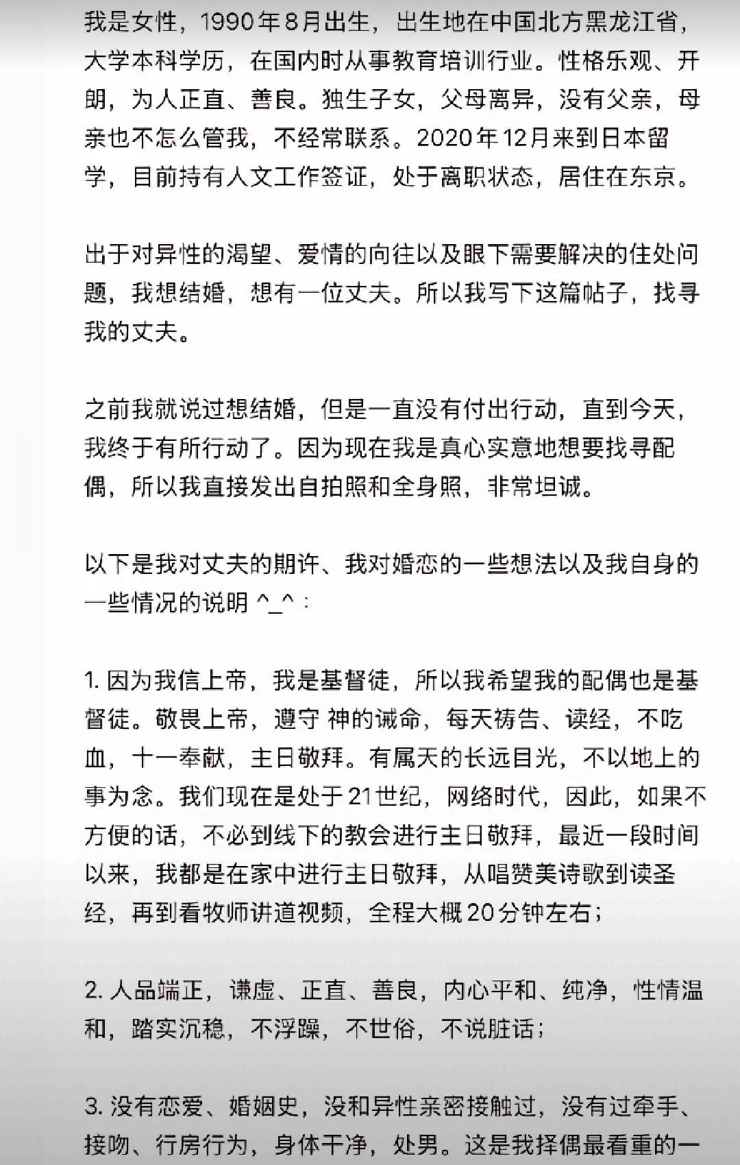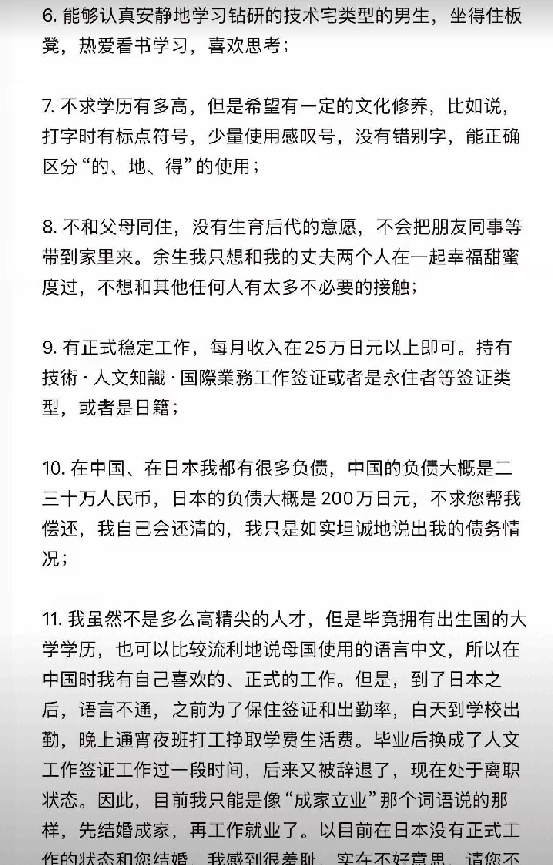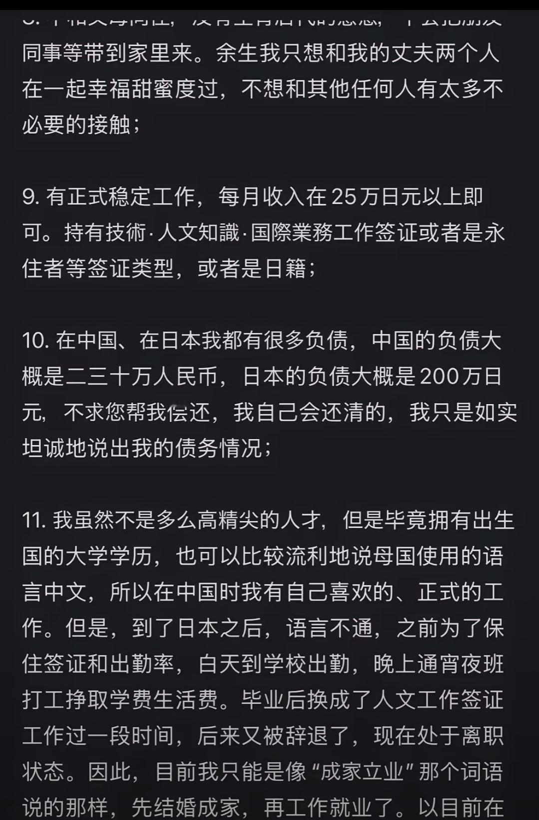 真的被日本欠租征婚的大姐整无语了!个人摆烂就算了,还拉着所有在日同胞为她的自私买单,这操作真的太掉价。 来日本四年日语停在50音,欠着百万日元外债还能吃到140斤,不想打工只想靠征婚找“长期饭票”,要求处男、每天按摩还不生孩子,连跳绳想长到170的想法都透着离谱。 可气的是,日本房东本就对中国租客偏见不少,30%以上都不愿出租,之前就有同胞欠租逃回国、把房间造得像垃圾场的先例,现在这事儿一闹,只会让后续同胞租房难上加难。 婚恋从不是逃避现实的避风港,在国外更该守规矩顾脸面。你觉得这种把个人责任甩给别人的行为,该被理解吗?