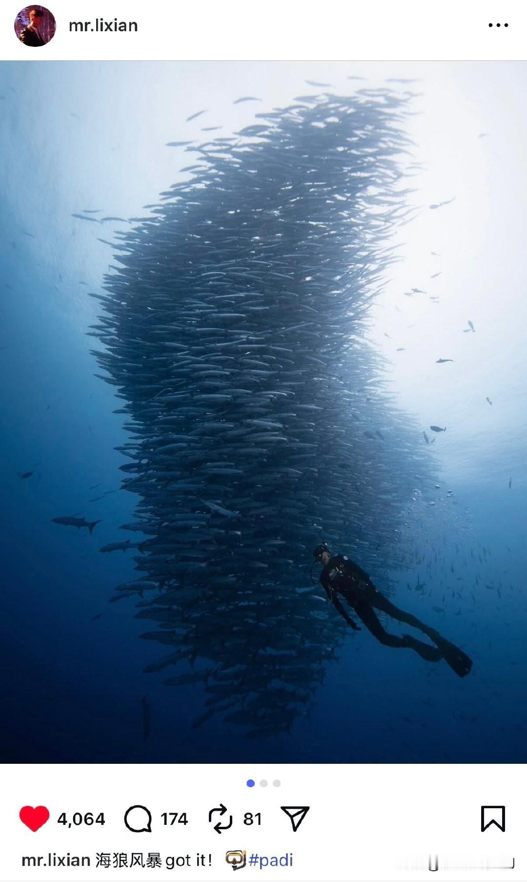 在印度尼西的海底秘境,见证自然的壮阔奇迹,探索永无止境。上次看了“杰克风暴” ,这次又被这张“海狼风暴”震撼到了,李现,你太酷了,谢谢你又带我们看了不一样的见山海,跟着你真的长见识呀,每一趟旅程和每一个震撼的水下画面,都是属于海洋守蔚者 的难忘瞬间。未来还有更多美好等待我们一起探索,真让人期待!