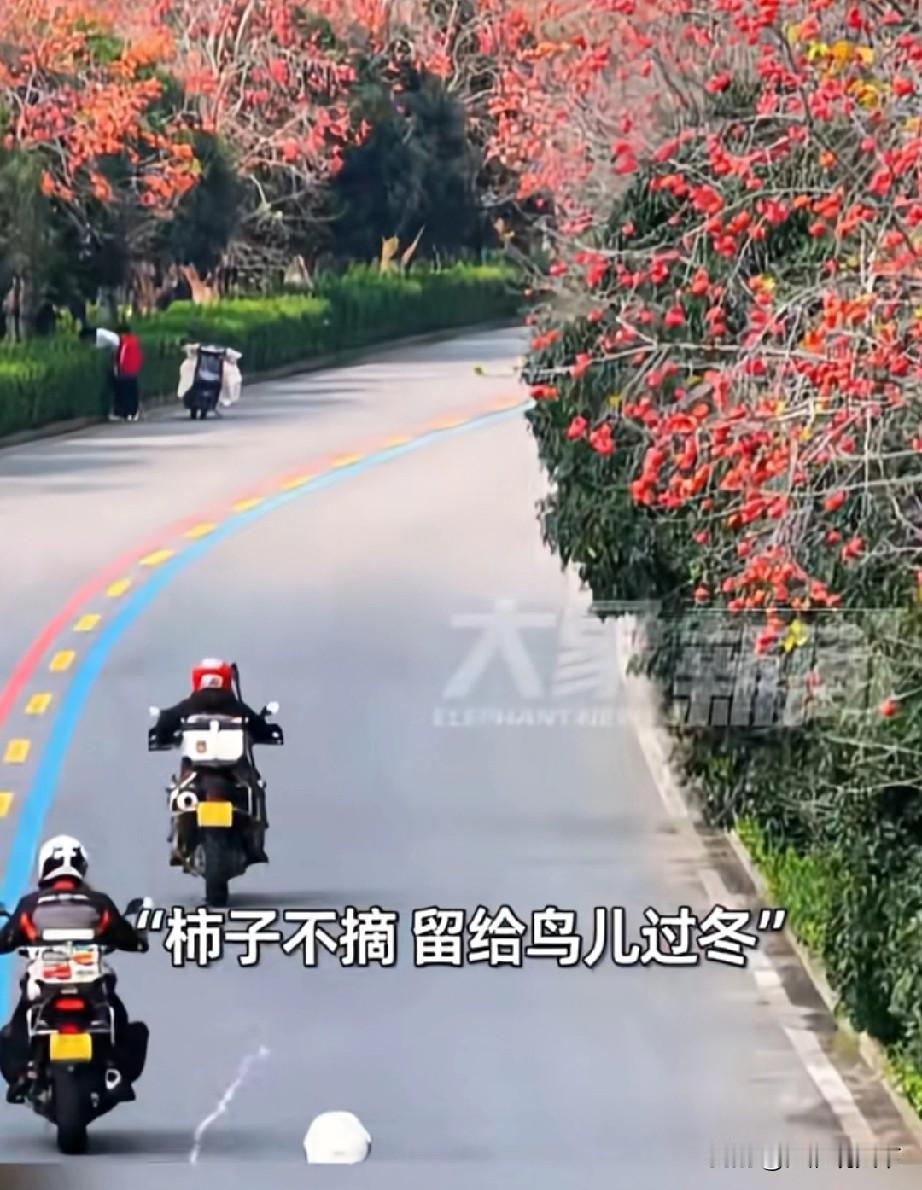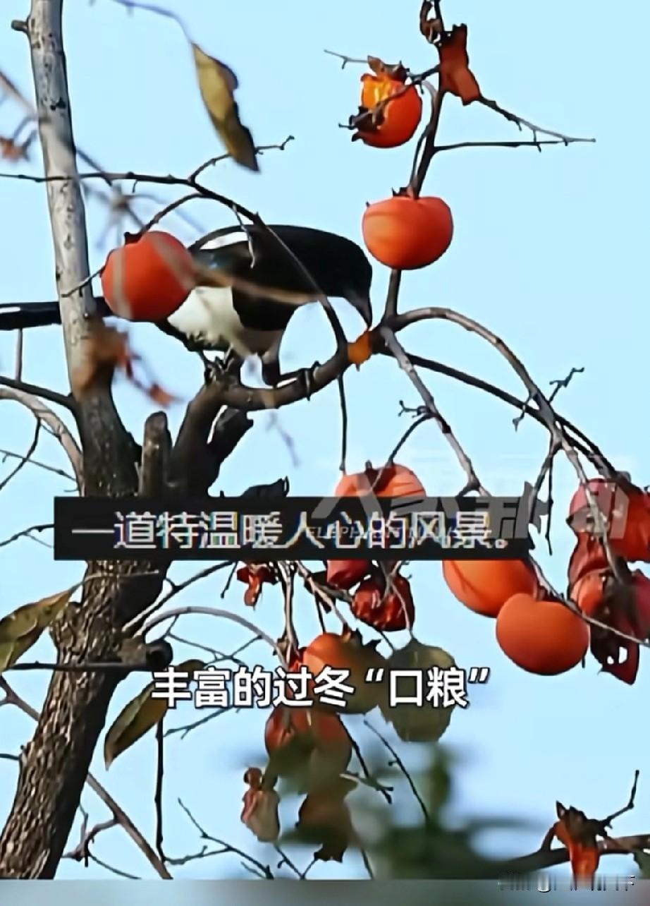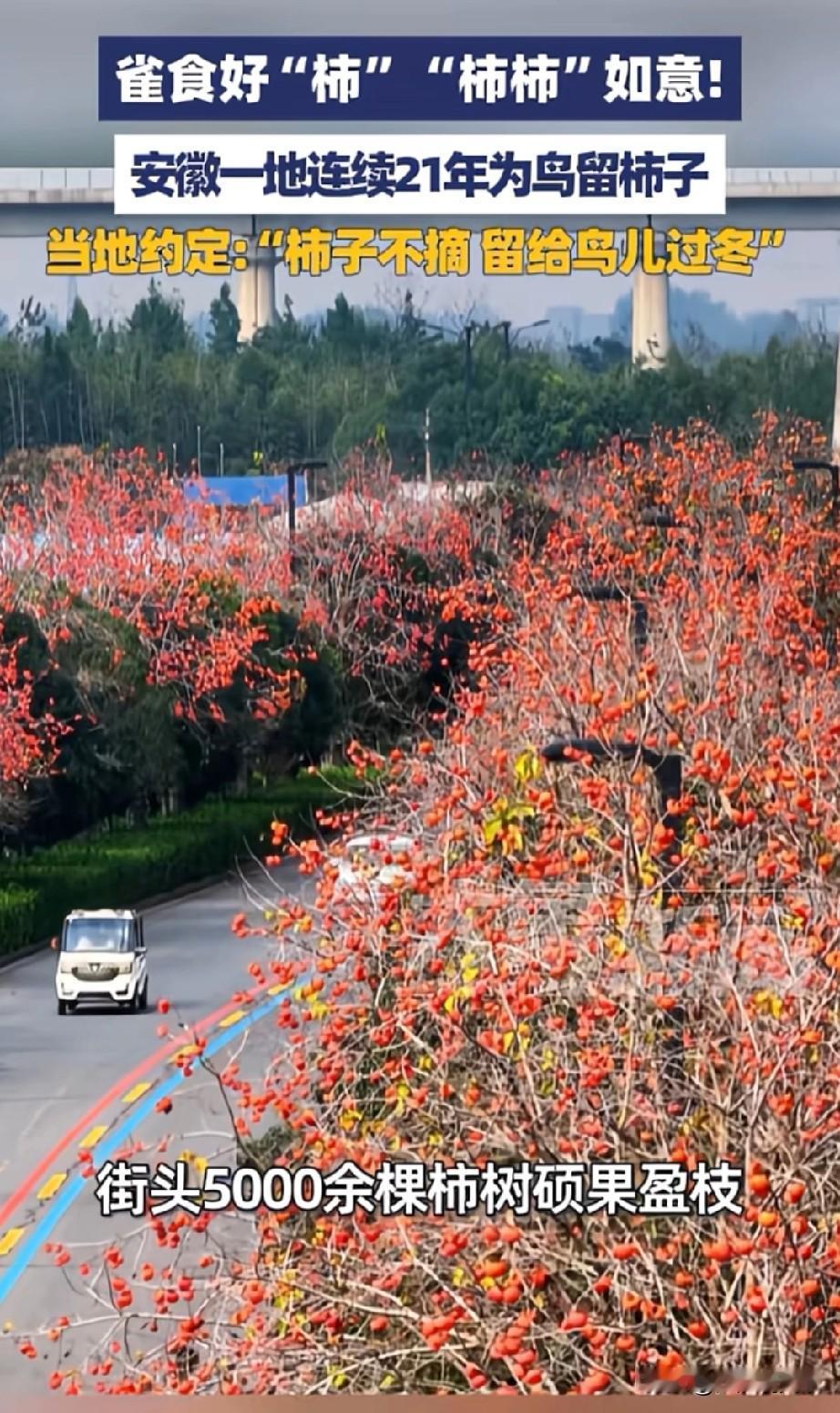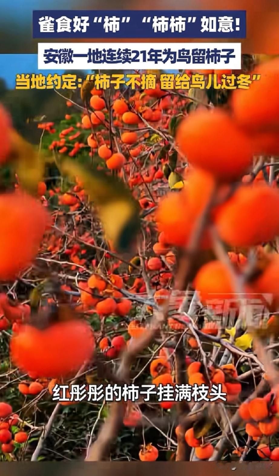 安徽省阜阳市颖上县,21年柿子不摘留给鸟儿过冬,温暖人心 大象新闻报道的一个新闻,让全国网友惊叹,在安徽省阜阳市颍上县,街头5000多颗柿子树上的柿子,全部不摘,留下来给鸟儿当过冬食物,并且这不是第一年这么做了,已经连续坚持了21年。 2005年,颍上县引进柿子树作为道路行道树种时候就约定,柿子不摘留给鸟儿过冬做食物,人与动物和谐相处,独特的生态景观,也是颍上县最靓丽的风景线。 大城市有大城市的繁华,小城市有小城市的风景,国内有几千个像颍上县这样暖心的大中小城市,才形成温暖美丽的大中国。