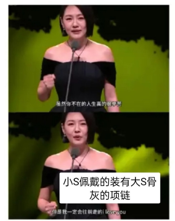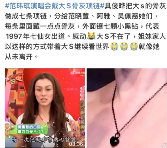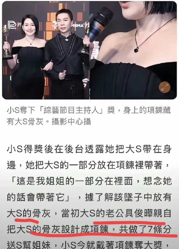 之后有网友发现范玮琪和小S得金钟奖时佩戴的项链疑似是同款,随后有爆料称,具俊晔把大S的骨灰做成了项链,送给了七个亲友,其中包括小S、范玮琪、范晓萱、阿雅、吴佩慈、大S大姐徐熙娴及邻居阿如。但大S子女(汪希玥、汪希箖)及母亲黄春梅未在名单中。