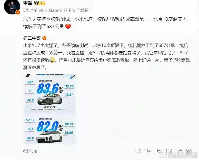 雷军回应YU7冬测数据有没有小字“建议雷总在冬测海报大字‘续航第一’下面,补一行小字:‘指本次测试目标达成’”。或者“今天10月26日,北京还没供暖,这冬测来得比暖气还早,合着‘冬天’也按‘设计目标’算”