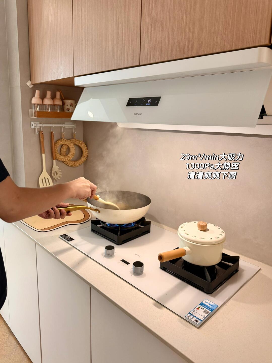 以前做个爆炒漂亮饭,满屋油烟呛人,精心搭配的厨房也瞬间变得“油腻”,长期下去都担心自己变成黄脸婆。而G2烟机的鲲鹏风道带来29m³/min 超大风量和1300Pa的超强静压,油烟🌪瞬间就能被吸走,咱这半开放式厨房也能放心做川菜,精致女生任性下厨,做完饭身上还是香香的