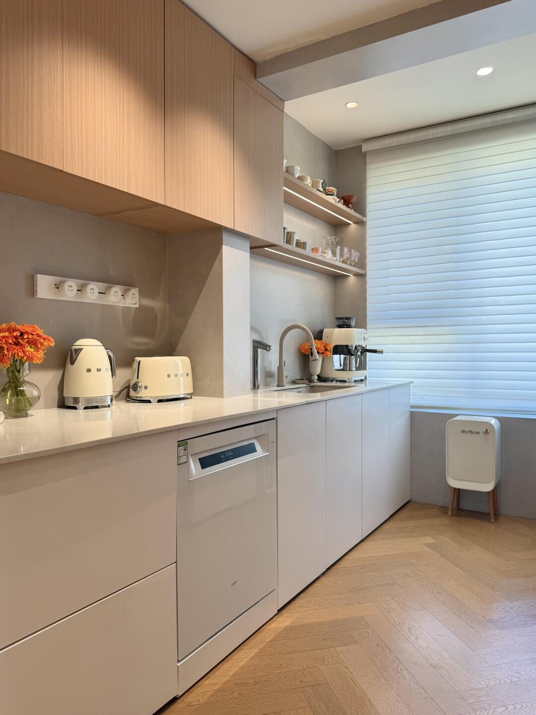 橱柜做了全屋定制,上层原木竖条纹,与低饱和度的原木地板相互辉映,下层奶油白板,搭配起来很温馨