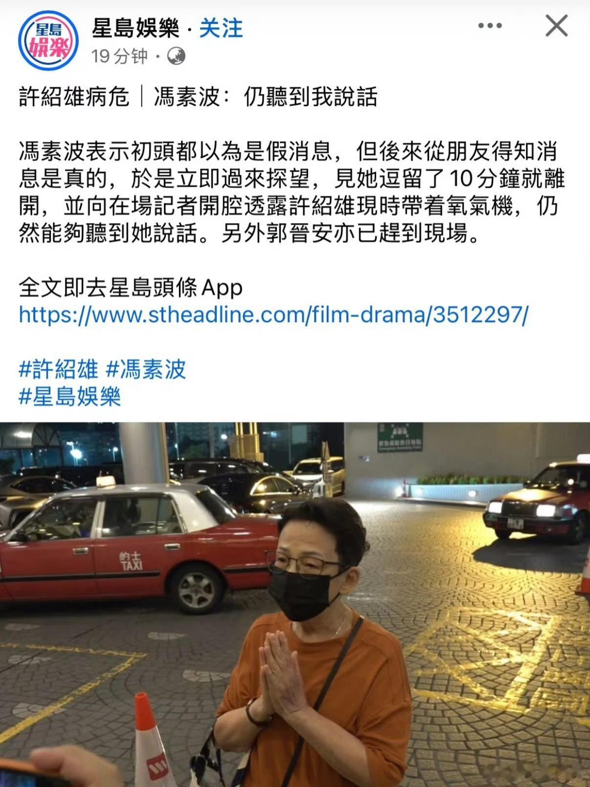 冯素波透露许绍雄最新情况 冯素波透露许绍雄最新情况,冯素波探望后离开医院时回答记者称许绍雄戴着氧气机,“他听到我讲话。”愿平安[捂嘴哭]
