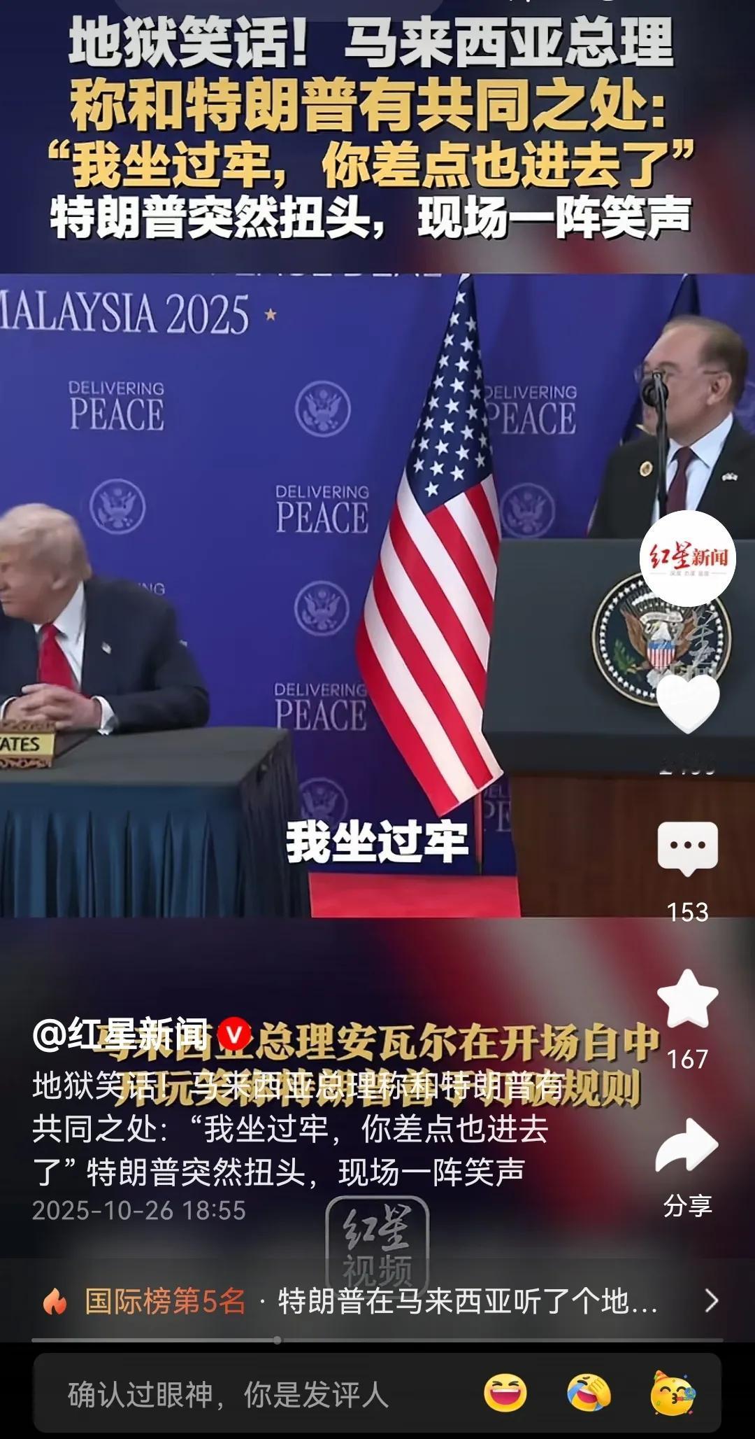 “我坐过牢,你也差点进去了”,马来西亚总理安瓦尔在东盟峰会上当众开特朗普玩笑。 1998年9月,安瓦尔因渎职罪和鸡奸罪指控被捕并入狱;2014年3月,安瓦尔因性侵指控被判入狱5年。两案于2018年得到特赦,安瓦尔获释。 但安瓦尔对两起案件的指控都予以否认,坚称自己受到政治迫害。 而特朗普一生遭遇无数官司,最糟糕的情况发生在其总统第一任期结束后,一波波指控汹涌而至,事情严峻到离入狱不远。 虽然安瓦尔有贴脸讨好之意,但其所说的也算是事实。