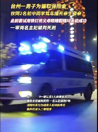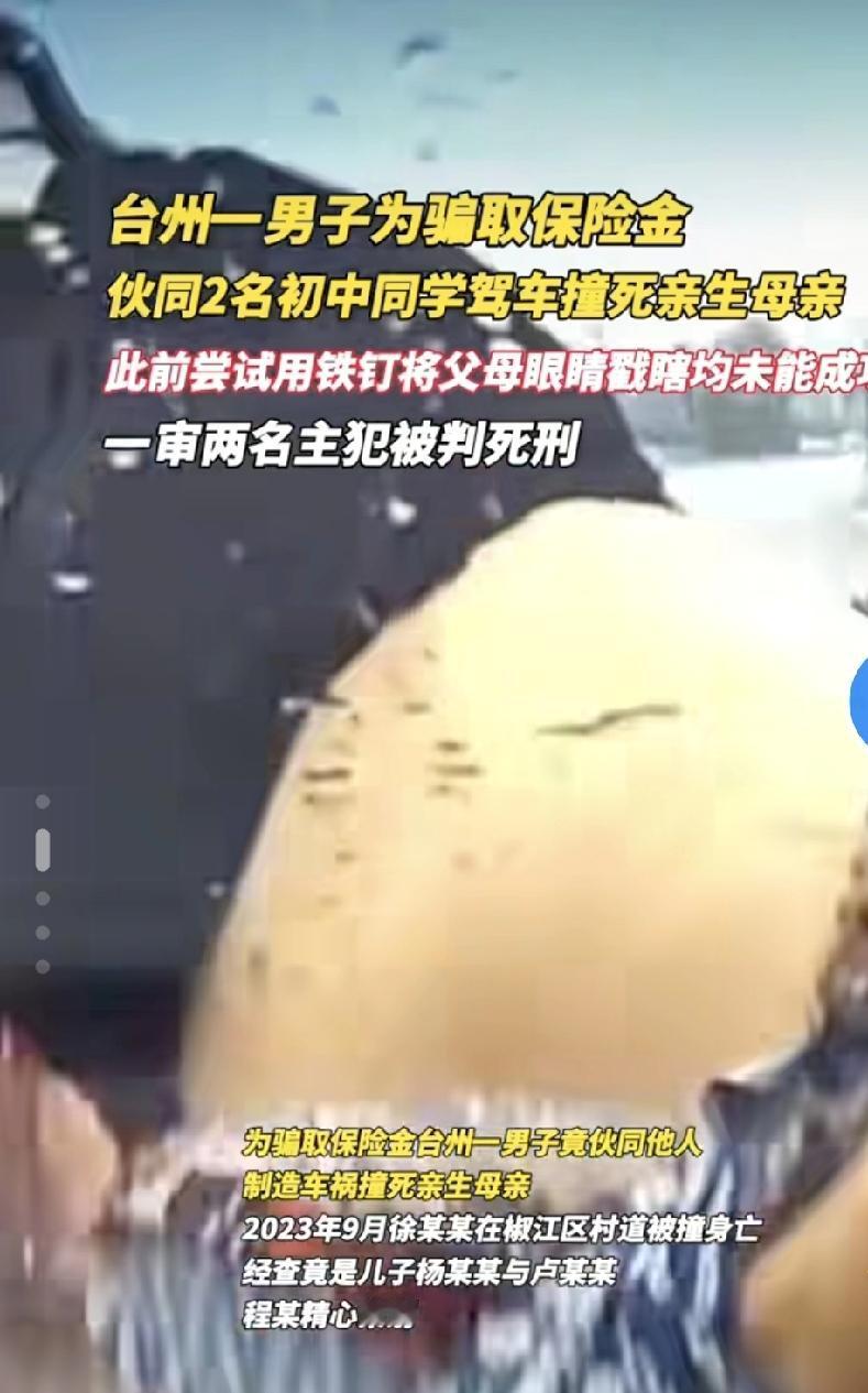 31万理赔款挥霍一空后,他竟联手外人撞死44岁亲妈!细节令人发指 “妈,我带你去个地方。”谁能想到,这句寻常的话竟是亲生儿子设下的死亡陷阱。浙江台州这起弑母骗保案,把人性的贪婪撕开了血淋淋的口子 。 一切始于一笔31.99万的保险理赔金。44岁的徐某某车祸住院后,这笔救命钱成了儿子卢某某的“提款机”。他伙同朋友杨某某,48小时内就通过偷转支付宝、柜台取现等方式盗走全款,苹果手机、华为折叠屏、豪车租赁……眨眼间便挥霍一空。 谎言败露后,卢某某非但没有悔改,反而和杨某某、程某合计出更恶毒的主意:制造车祸杀母骗保。他们先两次试图戳瞎卢某某的父亲未果,最终将目标锁定在母亲身上。事先踩点无监控路段、查询撞人车速、约定分赃比例,卢某某亲自将母亲骗到现场,眼睁睁看着她被撞飞身亡 。 更令人脊背发凉的是,卢父早已得知计划,却只说了句“随便你们”。如今主犯被判死刑,但44岁母亲的生命再也回不来了。 网友说得对:“虎毒尚不食子,这人连畜生都不如。”钱没了能再赚,良心丢了便万劫不复。这起案件敲响的警钟,每个为人子女者都该记一辈子。评论区聊聊你的看法?