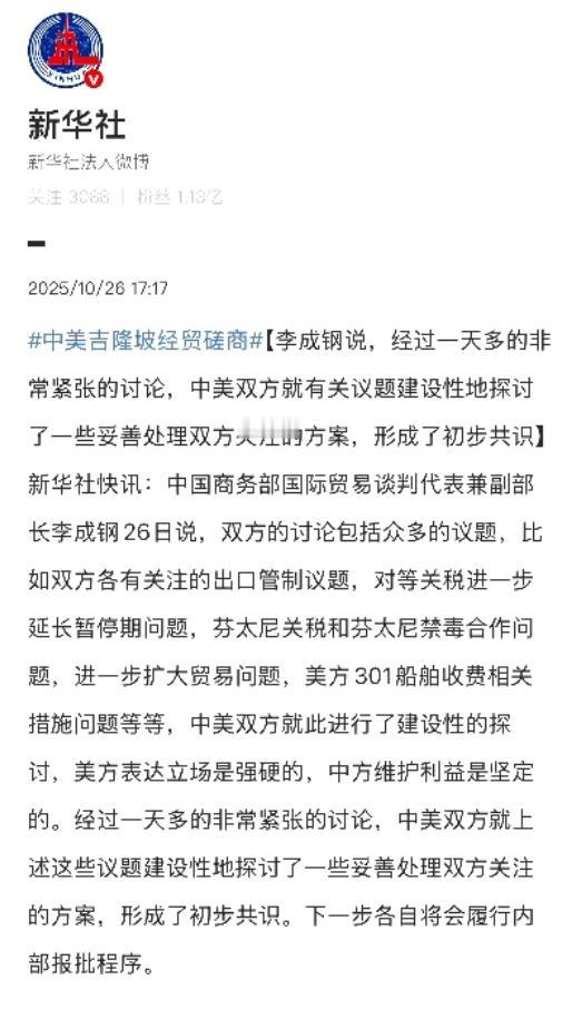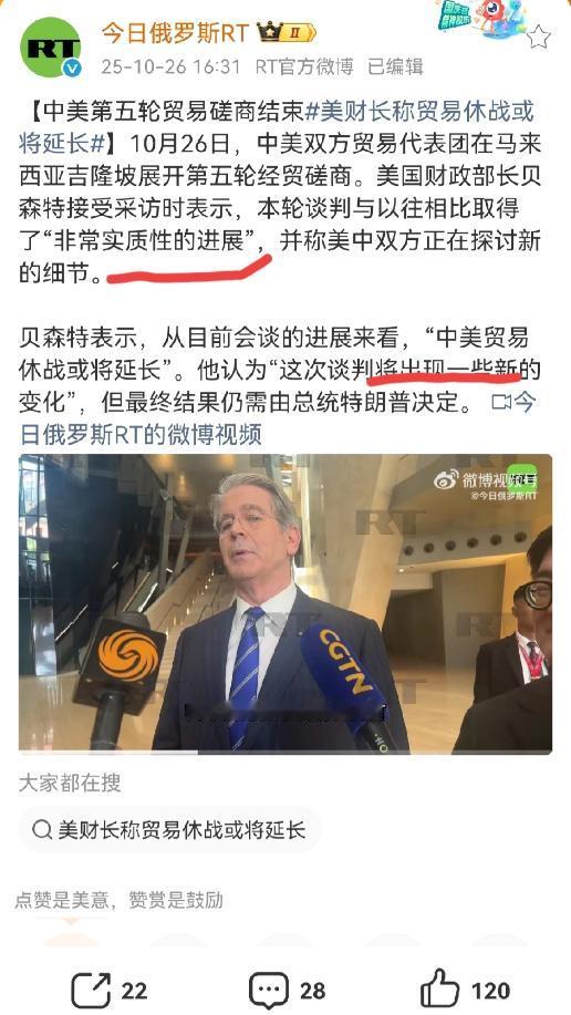 中美第五轮贸易磋商结束:美财长称贸易休战或将延长 就在10月26号,中美经贸团队在马来西亚吉隆坡刚结束第五轮磋商,美国财长确实说了贸易休战有可能延长,而且双方还达成了不少基本共识。 说真的,这次磋商太关键了,毕竟原来的关税暂停期11月10号就到期了,之前美方还喊着要加100%的关税,把气氛搞得特别紧张。 现在总算松了口气,不是说问题全解决了,但至少没往坏了走,这就很不容易。 要知道这可是今年5月以来双方第五次面对面谈,前两天第一天就聊了五个半小时,能谈出点成果,说明两边都明白硬扛着没好处。 其实这次谈的事儿都特实际,跟两边的利益都挂钩。美方那边最急的是稀土、大豆和芬太尼这几样,稀土这东西咱们占全球八成产量,美国的电动车、军工造导弹都离不了,他们怕咱们卡脖子;大豆更不用说,之前咱们买得多,后来关税一折腾,美国农场主的大豆堆仓库里卖不出去,利润跌了三成,能不急吗? 咱们这边,主要是想让美方取消对咱们海事物流、造船业的不合理限制,还有就是把关税暂停期续上,毕竟加税最后还是老百姓买单,不管是他们自己还是咱们这边,物价都得涨。 美方这次态度转软,根本不是突然良心发现,纯粹是自己扛不住了,前阵子他们还放狠话要加税,结果国内企业先闹起来了,加税成本最后都摊到消费者身上,通胀压力本来就大,真加了税老百姓更受不了。 而且他们想拉着盟友搞供应链,人家也不傻,怕断供不敢跟着瞎闹。 反观咱们,早就不是只靠美国市场了,前三季度对东盟出口都占到18%了,底气足得很,这才有平等谈的资本。 咱们的立场一直特明确,不是怕谈,更不是怕打,而是觉得没必要两败俱伤,就像中方领导说的,合则两利、斗则俱伤,这话说得太实在了。 这次磋商咱们也没吃亏,该争的都争了,美方也承认讨论是建设性的,还说不再考虑加100%的关税,这就是咱们硬气谈出来的结果。 要是咱们没点反制手段,稀土管制不收紧,对等关税不跟上,他们能这么快松口吗?肯定不能。 可能有人会问,这贸易休战延长了,跟咱们普通人有啥关系?关系可大了。 首先那些做进出口生意的企业不用整天提心吊胆了,订单能稳住,工人的饭碗就稳。 然后物价也能稳点,要是真加了税,不少进口东西就得涨价,咱们买菜、买家电都得多花钱。 还有农产品,咱们要是能继续稳定进口,国内市场供应也更充足,价格波动不会太大,对咱们老百姓来说都是实实在在的好处。 不过也得清醒点,别觉得这下就万事大吉了,美方说了,出口管制那些措施还不会变,说明他们在科技领域还想卡咱们脖子,长期的竞争肯定还在。 现在只是达成了初步框架,接下来还得敲定细节,走各自的报批程序,这中间说不定还有波折。 但不管怎么说,这次能谈出积极结果,就说明对话比对抗管用,只要两边都抱着互利的心思,总能找到解决问题的办法。 说来说去,这事儿最核心的还是咱们自己有底气了,这些年咱们不是光靠跟美国做生意,而是把市场铺到了全世界,内需也拉起来了,所以不怕他们搞极限施压。 美方那边也看明白了,跟中国脱钩根本不现实,还得吃亏,所以才愿意坐下来好好谈。 接下来就看他们是不是真能说到做到,别刚谈完又变卦,毕竟磋商成果来之不易,得两边一起维护才行。 总的来说,这次贸易休战可能延长是个好消息,不光咱们两国受益,全球经济也能松口气。 但咱们也不能掉以轻心,继续把自己的日子过好,企业把产品做好,国家把产业链稳住,不管将来他们怎么变,咱们都能扛得住。 毕竟这么多年的经验摆在这,只要咱们自己硬气,就不怕任何风浪。 参考资料: 环球网 《围绕多项重要经贸问题,双方进行“建设性的”探讨,中美吉隆坡磋商达成基本共识》