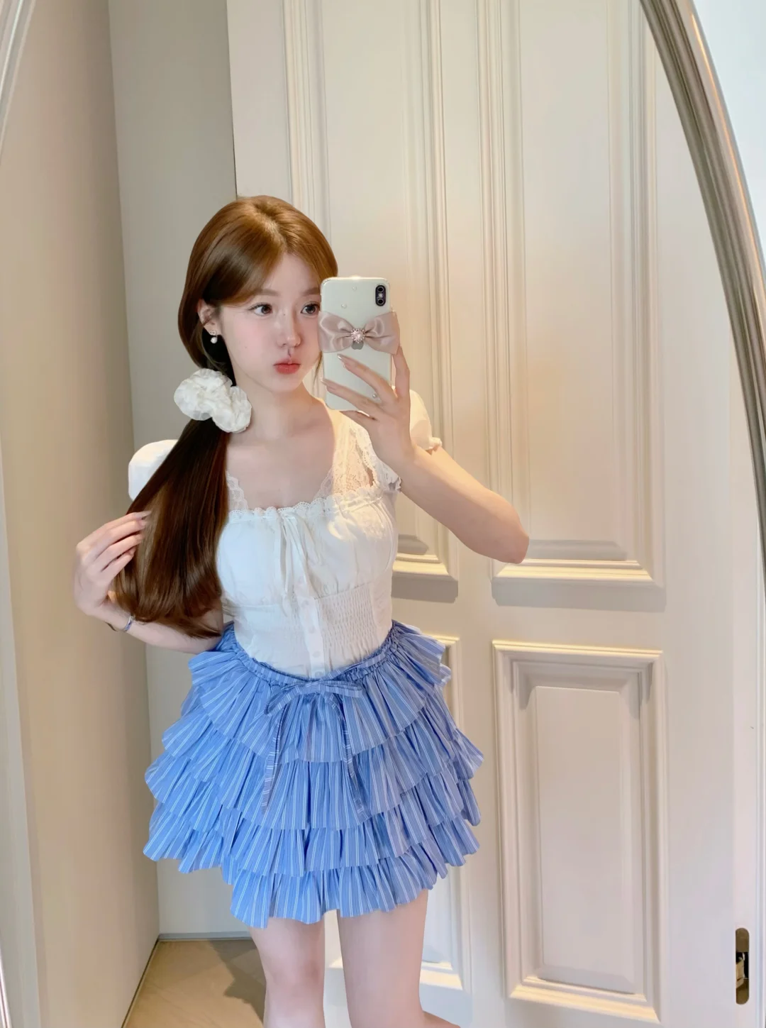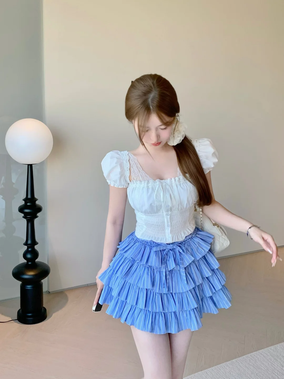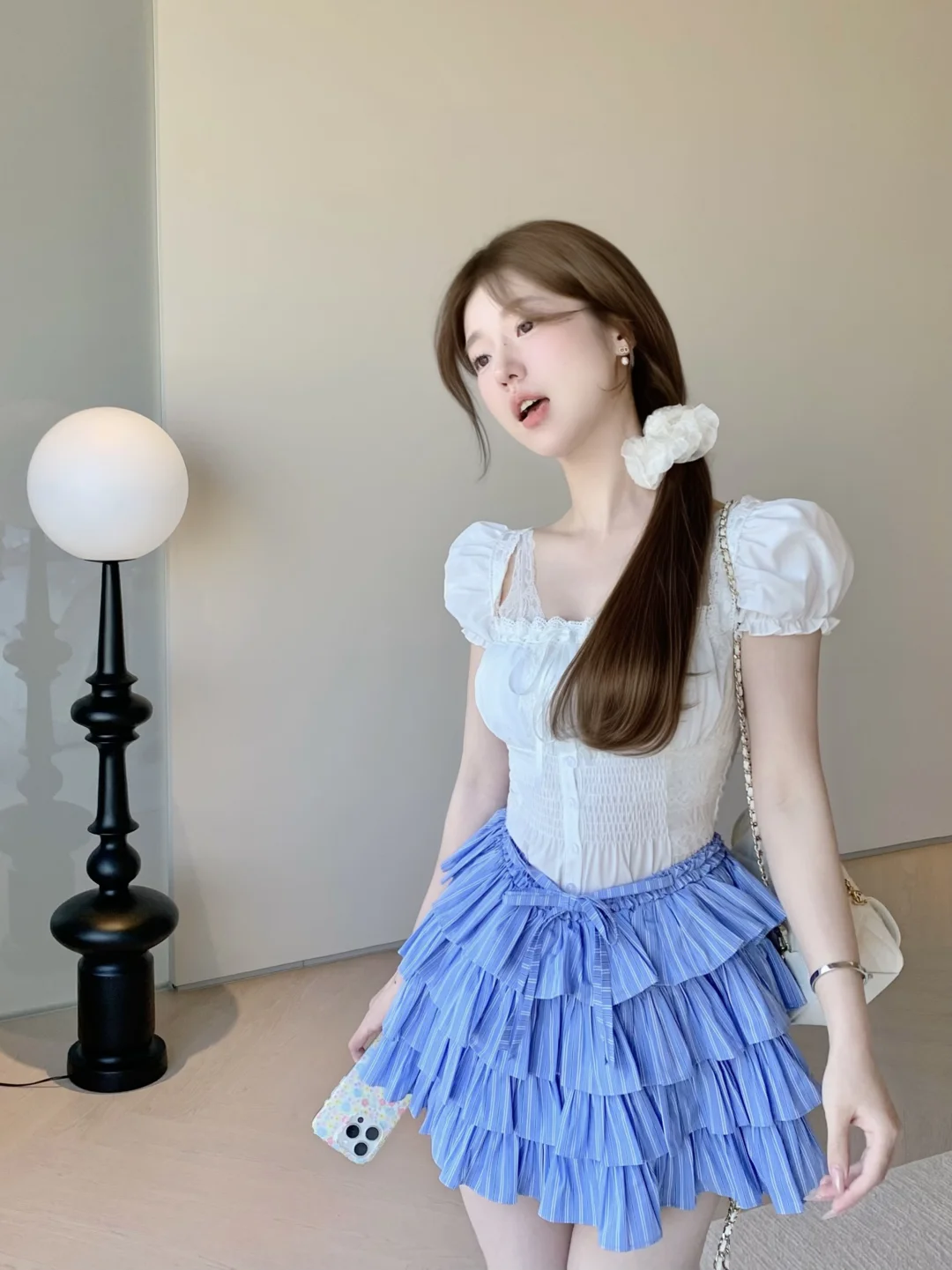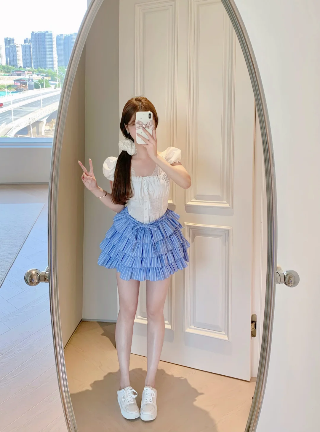 韩系欧尼 少女感穿搭 约会穿搭 ootd夏日穿搭泡泡袖上衣 浅色系穿搭 夏天穿什么 小个子穿搭 显高穿搭