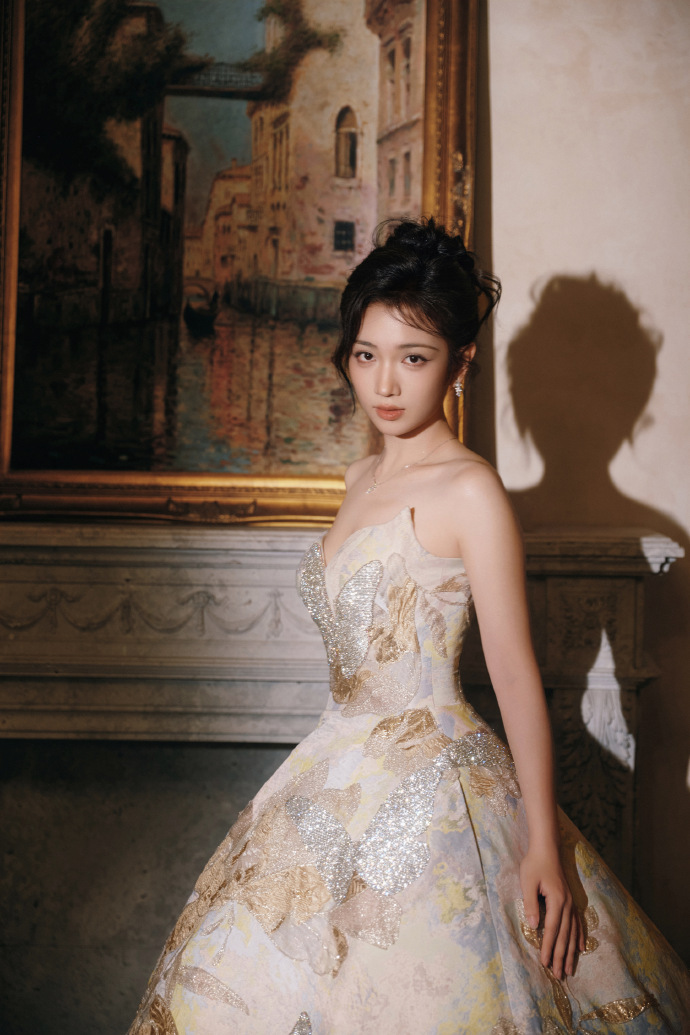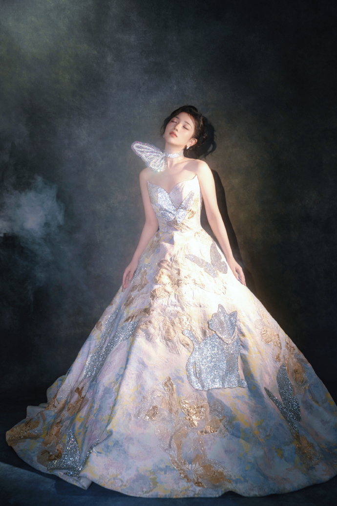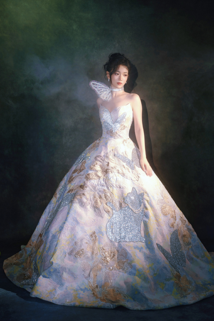 代露娃的蝴蝶海螺礼服融合海洋灵感,银色蝴蝶礼服则以蝶形设计凸显灵动,不同元素的运用都暗藏巧思,展现出时尚与自我的联结。代露娃蝴蝶海螺礼服代露娃银色蝴蝶礼服