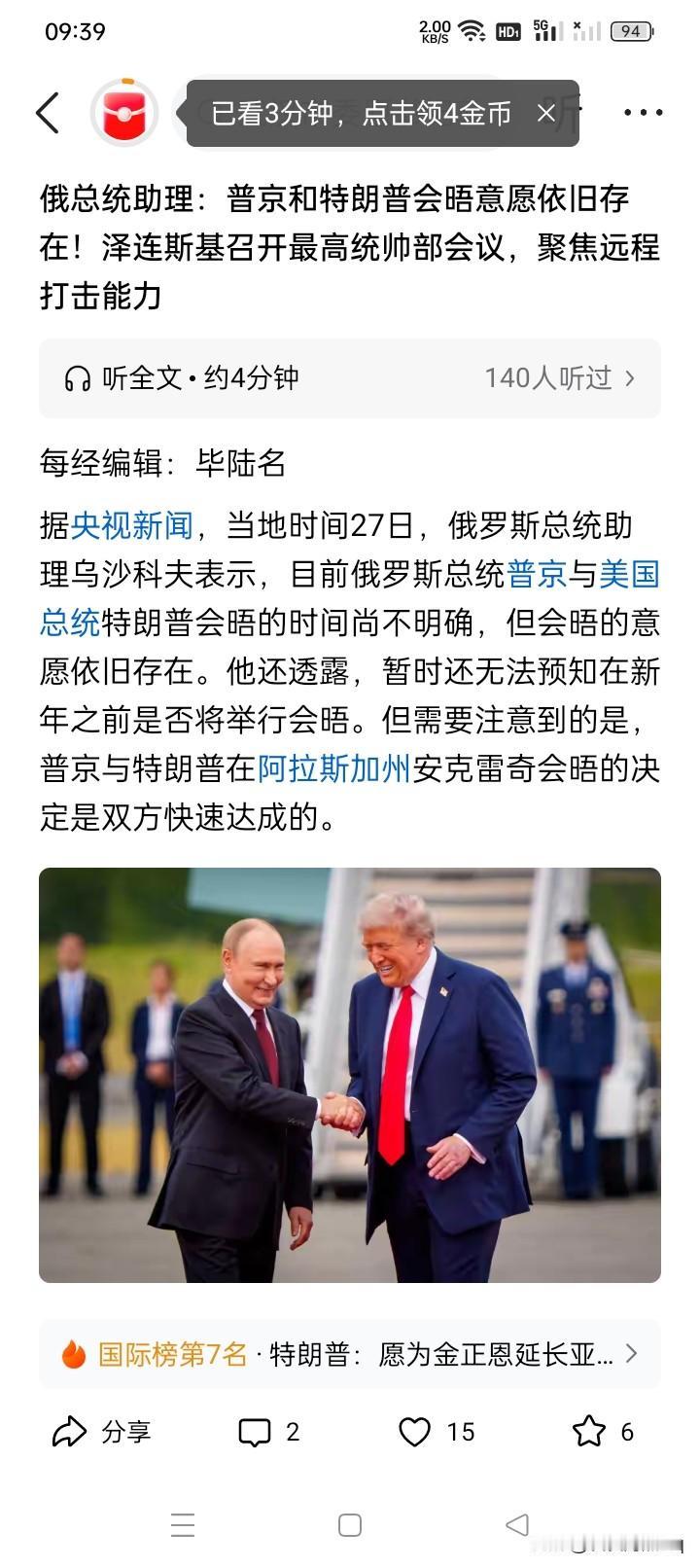 估计枉费苦心? 特朗普在10月17日与普京的电话中,提出与普京在匈牙利见面会晤。这种话,特朗普好像就是那么随口一说,似乎并没有进行深思熟虑,全面仔细衡量其价值和意义。 然而,随后国内国际形势的发展,大概也出乎特朗普的意料之外,特别是俄罗斯毫不客气的断然拒绝特朗普提出的俄罗斯与乌克兰,双方在现有的战线上停火的提议,无疑给特朗普当头一棒。而与此相反,乌克兰与欧洲的10几个国家和组织趁势而上,发表声明,表示坚决支持和拥护特朗普在目前战线上停火的提议。 10月22日,美国突然采取了对俄罗斯最大的两家石油公司很严厉的制裁。美国采取这种措施,好像一时让俄罗斯措手不及。 俄罗斯也不是个软骨头,10月26日,普京总统宣布,俄罗斯使用核动力的、号称拥有无限射程的“海燕”巡航导弹成功完成了测试。然而,特朗普仅仅只是用俄罗斯的附近就藏着全世界最大的美国核潜艇,它装备的导弹完全不必要拥有那么远距离的射程来回应。并且还表示,俄罗斯不是与我们开玩笑,我们也不是与他们开玩笑。 在此前后,特朗普似乎已经明确表示,在没有与乌克兰签署停火协议之前,他不会与普京见面。 可是,10月27日,俄罗斯总统助理乌沙科夫表示,目前俄罗斯总统普京与美国总统特朗普的会面时间尚不明确,但会面的意愿仍然存在。不知道乌沙科夫说的意愿,是普京的意愿、还是特朗普的意愿,或者是双方的意愿?
