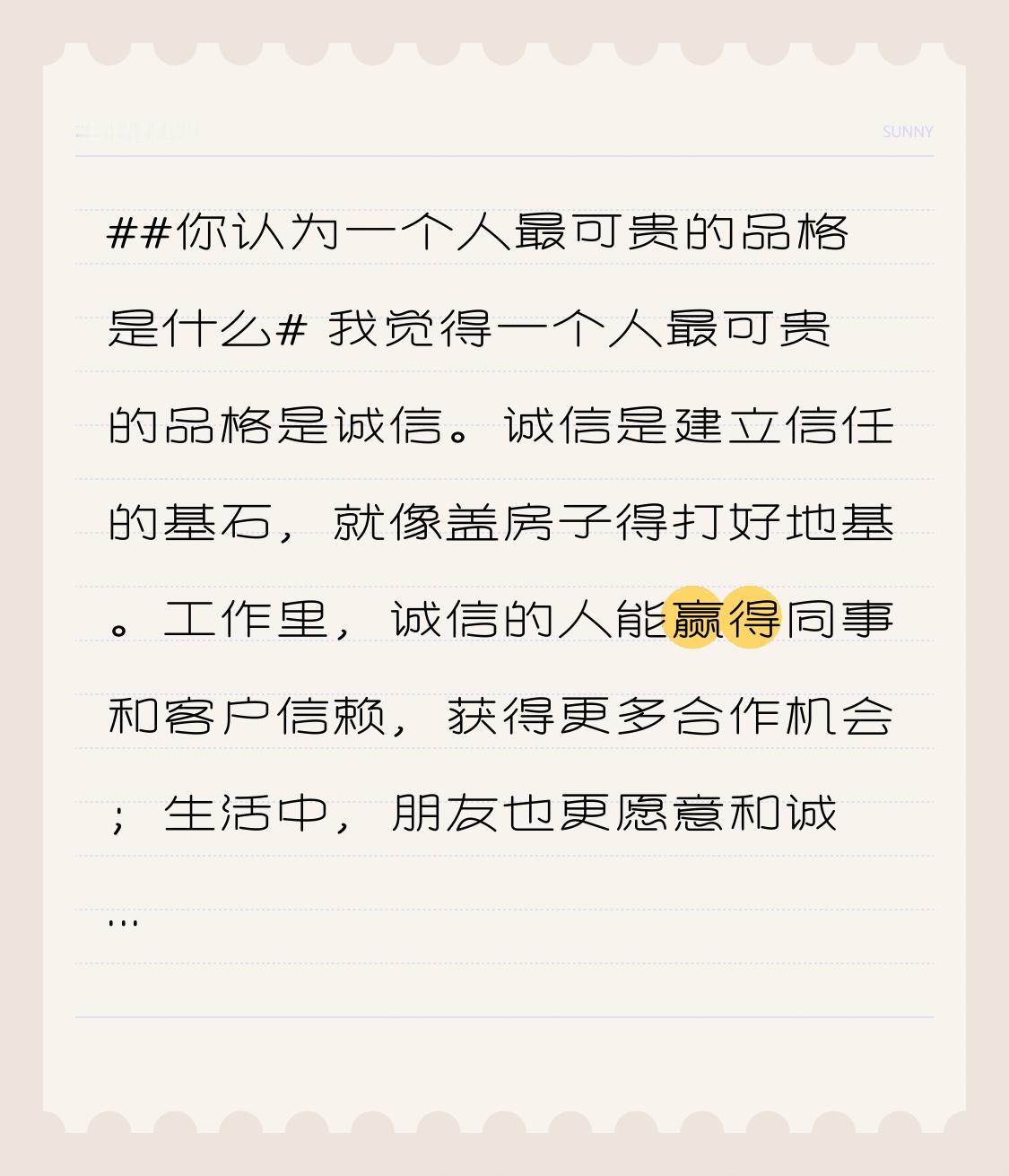 我觉得一个人最可贵的品格是诚信。诚信是建立信任的基石,就像盖房子得打好地基。工作里,诚信的人能赢得同事和客户信赖,获得更多合作机会;生活中,朋友也更愿意和诚实守信的人交往。 诚信还体现责任感。面对利益诱惑或外界压力,坚守诚信就是对自己和他人负责。比如答应别人的事,不管多难都做到,这就是诚信带来的担当。 而且诚信是品德修养的体现。有诚信的人更有同情心和谦逊心,懂得尊重他人。诚信还能带来内心平静,问心无愧地生活。没了诚信,很难在社会长久立足。